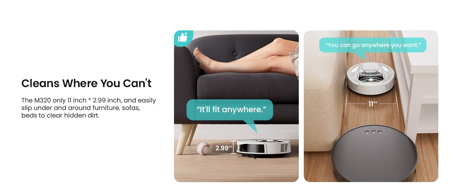 The 9. Lefant M320 features a slim profile, allowing it to reach hidden dirt under furniture for a thorough clean every time. Its matrix-pattern cleaning capability ensures that it crisscrosses on carpets to extract dust from every angle.