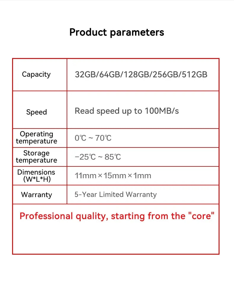 With read speeds up to 100MB/s, enjoy effortless file transfers and media playback. Whether you're using it for professional projects or personal memories, our memory card is tailored to your needs.