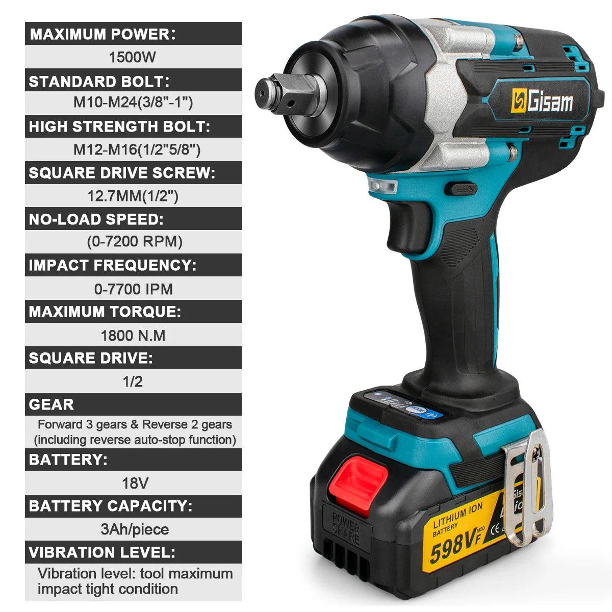 Introducing the 1800N.M Torque Brushless Electric Impact Wrench 1/2 Inch, a powerful tool engineered for professionals and DIY enthusiasts alike. This high-performance wrench delivers an astounding torque of 1800N.M, making it perfect for automotive repairs and heavy-duty construction tasks.
