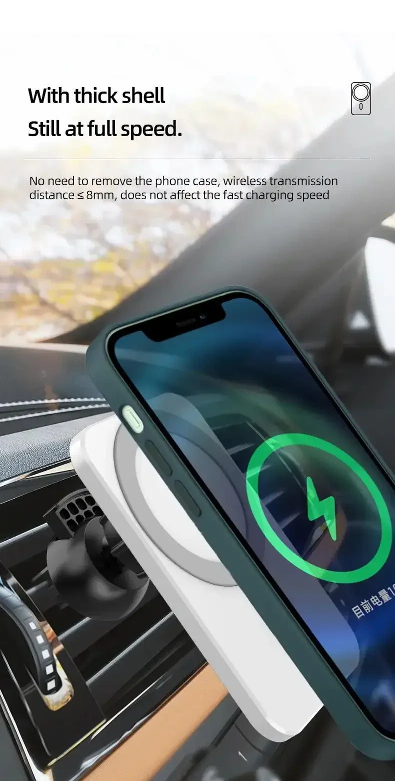 Magnetic Car Wireless Charger Universal IPhone Holder delivers effortless charging and hands-free driving. This versatile car accessory uses a strong magnet for secure hold, an upgraded air vent clip for safe installation, and a 360° rotating head for optimal viewing. Compatible with iPhone 15/14/13 Pro Max, Samsung, and Xiaomi devices.