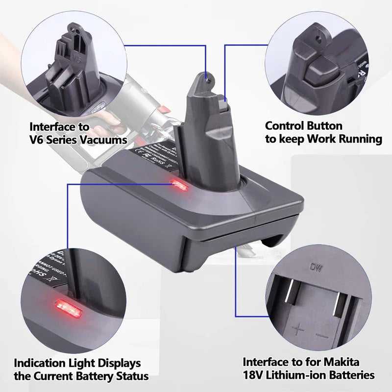 Transform your cleaning routine with the 18V Battery Adapter for Dyson V6 V7 V8 Compatible With Makita Dewalt Milwaukee Bosch. This innovative adapter allows you to utilize your existing 18V lithium batteries from top brands effortlessly, eliminating the need for multiple battery purchases.