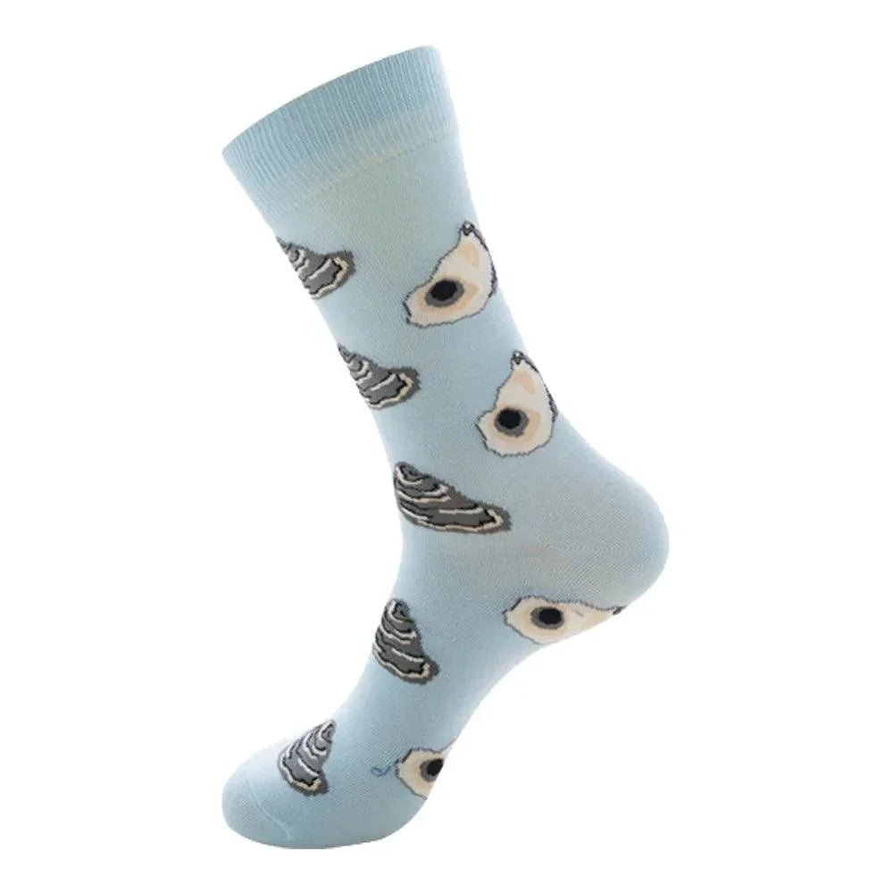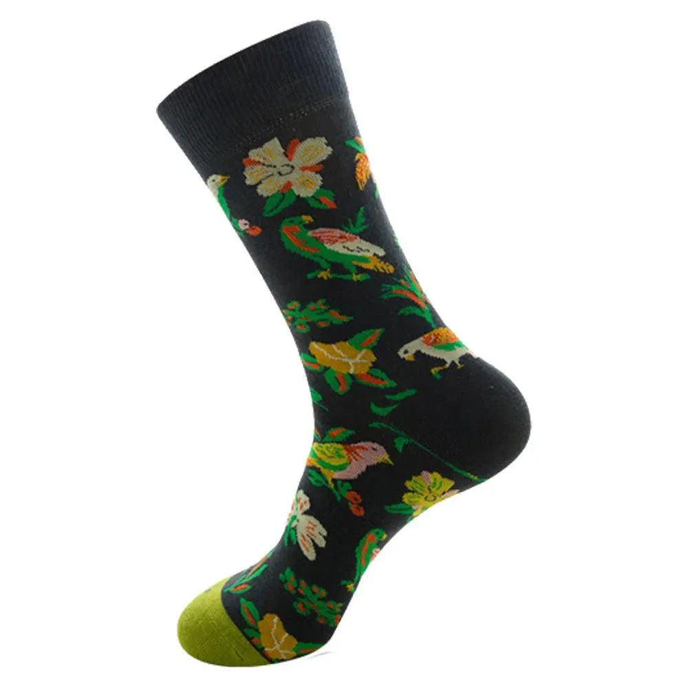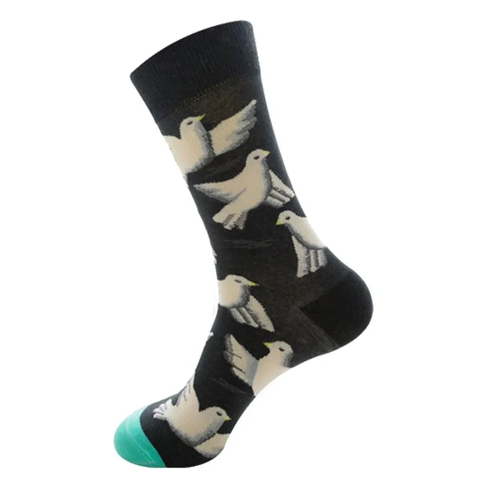 A: These socks fuse premium combed cotton with a durable 75% cotton, 20% nylon, 5% spandex blend to deliver soft, breathable comfort and a flexible, snug fit. The whimsical animal graphics—sheep, birds, shrimp, and alpacas—offer a unique, joyful vibe perfect for daily wear.