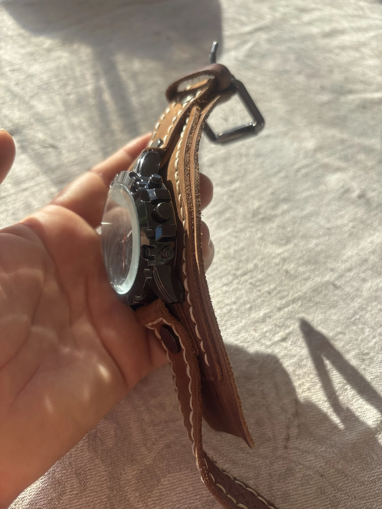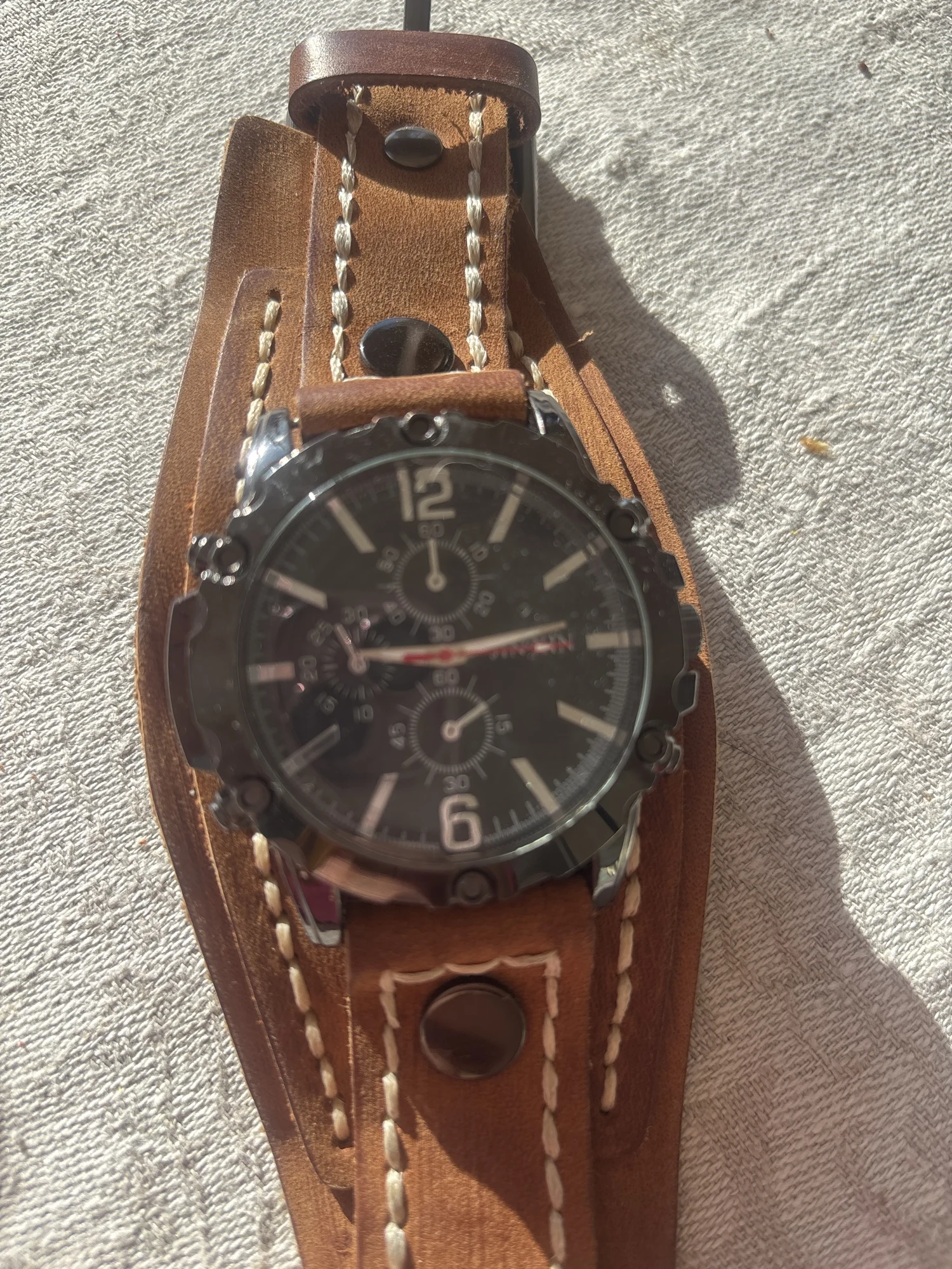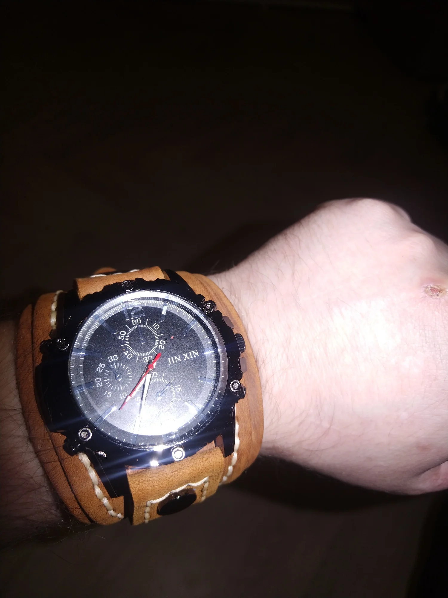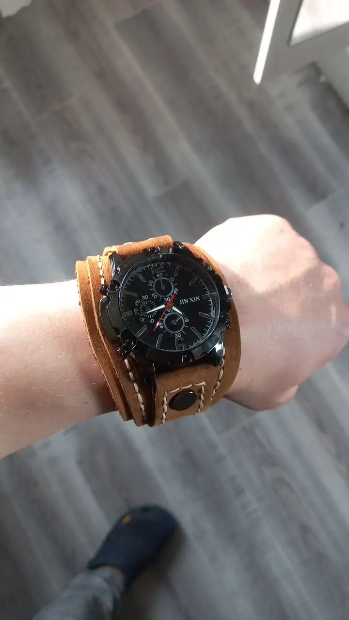 • Genuine Leather Bracelet: The wide cowhide bracelet adds a rugged yet sophisticated touch.