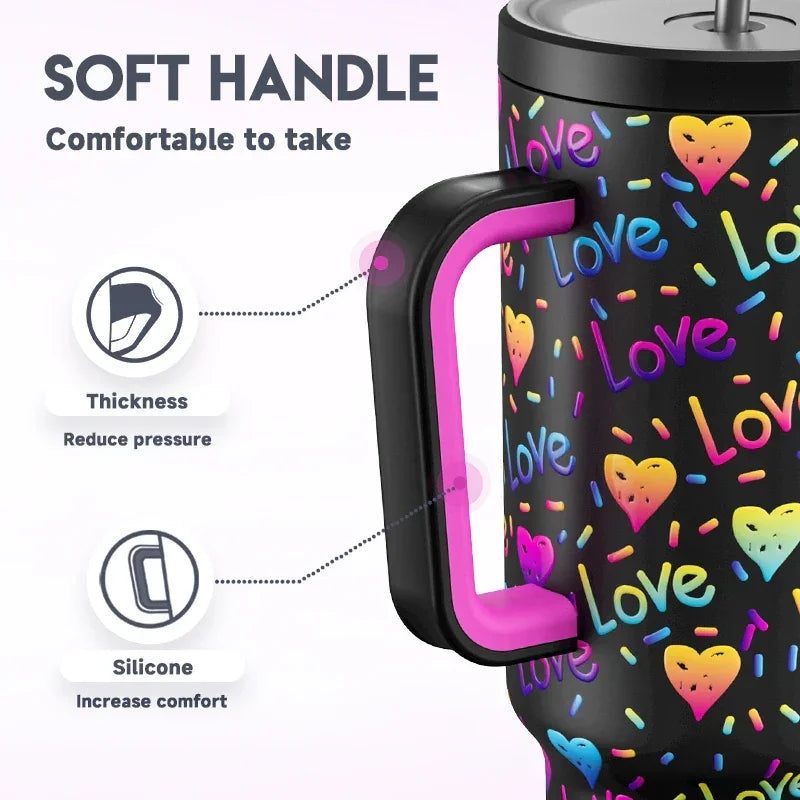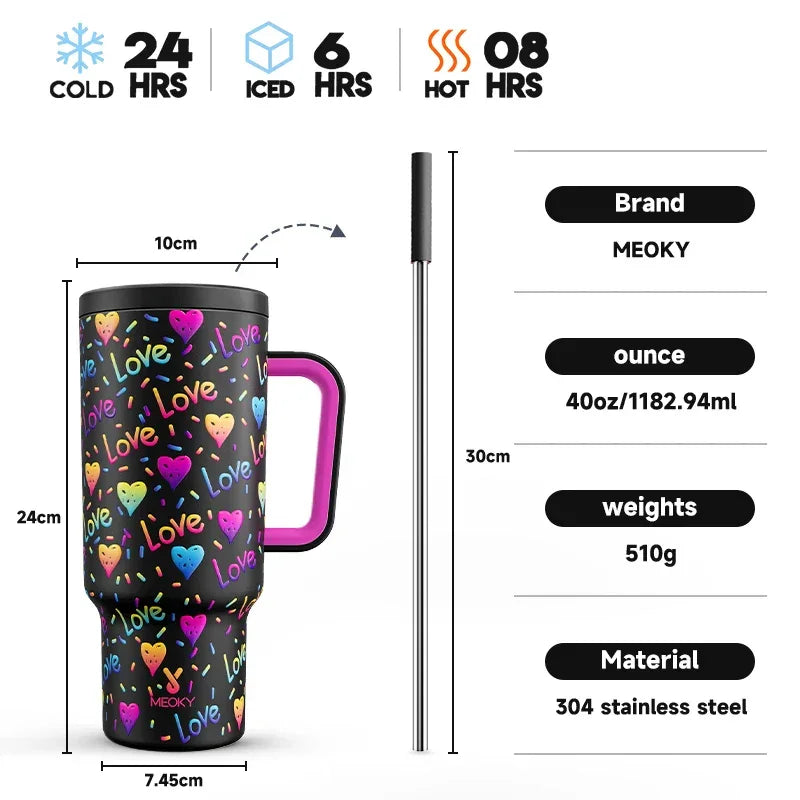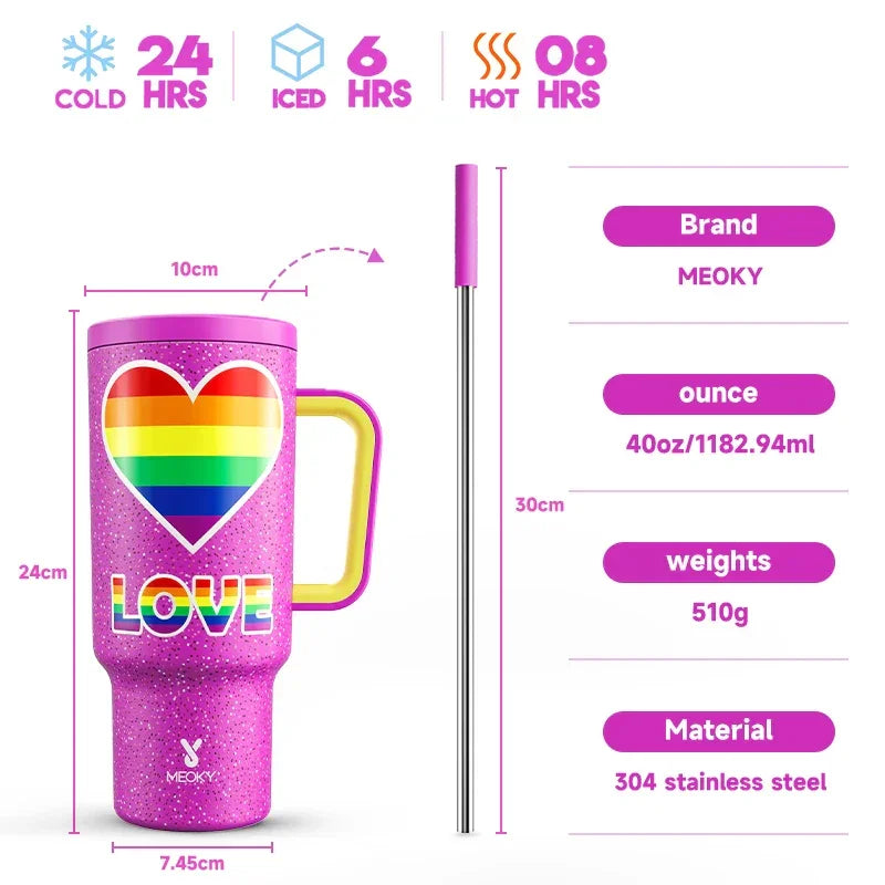 Meoky Cup 40oz Large Tumbler With Straw Lid Insulation keeps drinks hot or cold for up to 36 hours in premium stainless steel. The leak-proof lid and straw system prevent spills, while the ergonomic handgrip and wide mouth make refills effortless. Eco-friendly, durable, and proudly featuring a Pride Month design for everyday adventures. Ideal for workouts, commutes, office, or outdoor activities with the Meoky Cup 40oz experience.