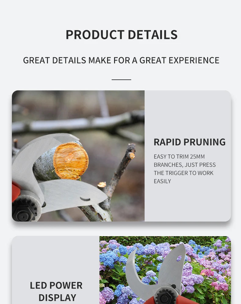 • Exceptional Efficiency: Experience 8-10 times the efficiency of traditional pruning tools, allowing for quicker, cleaner cuts without the strain on your hands.
