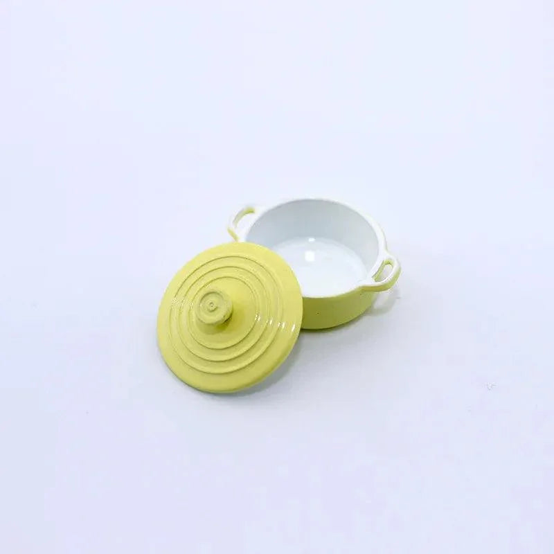 The pot is sized to complement standard 1:12 dollhouse cookware, furniture, and décor. It pairs well with tiny lids, spoons, and matching color sets, enabling cohesive kitchen scenes and enhanced narrative potential.