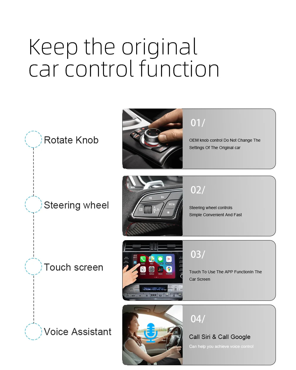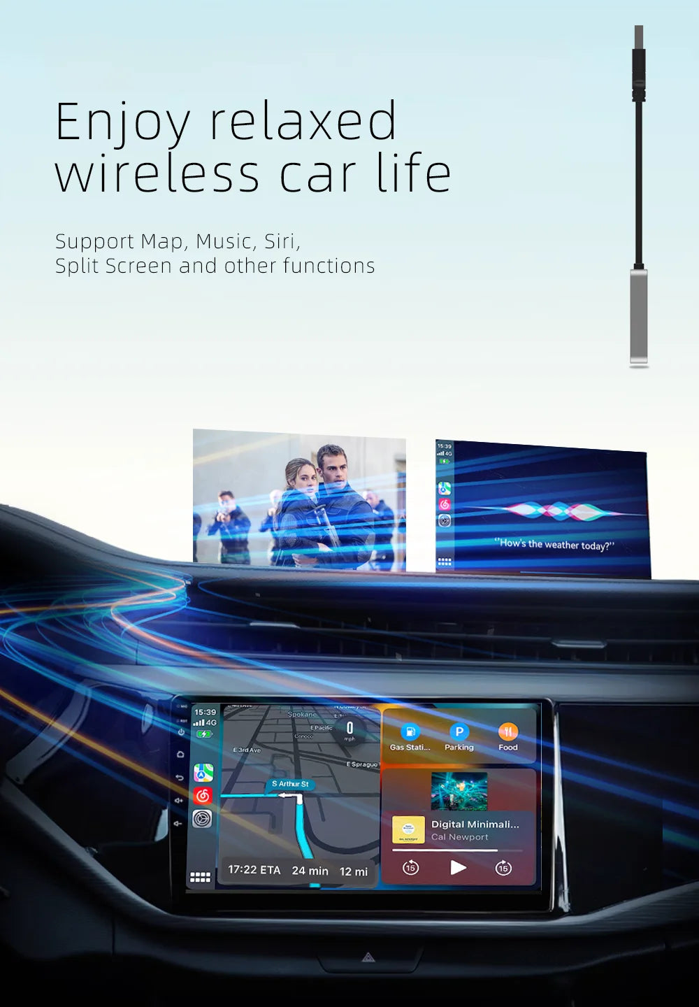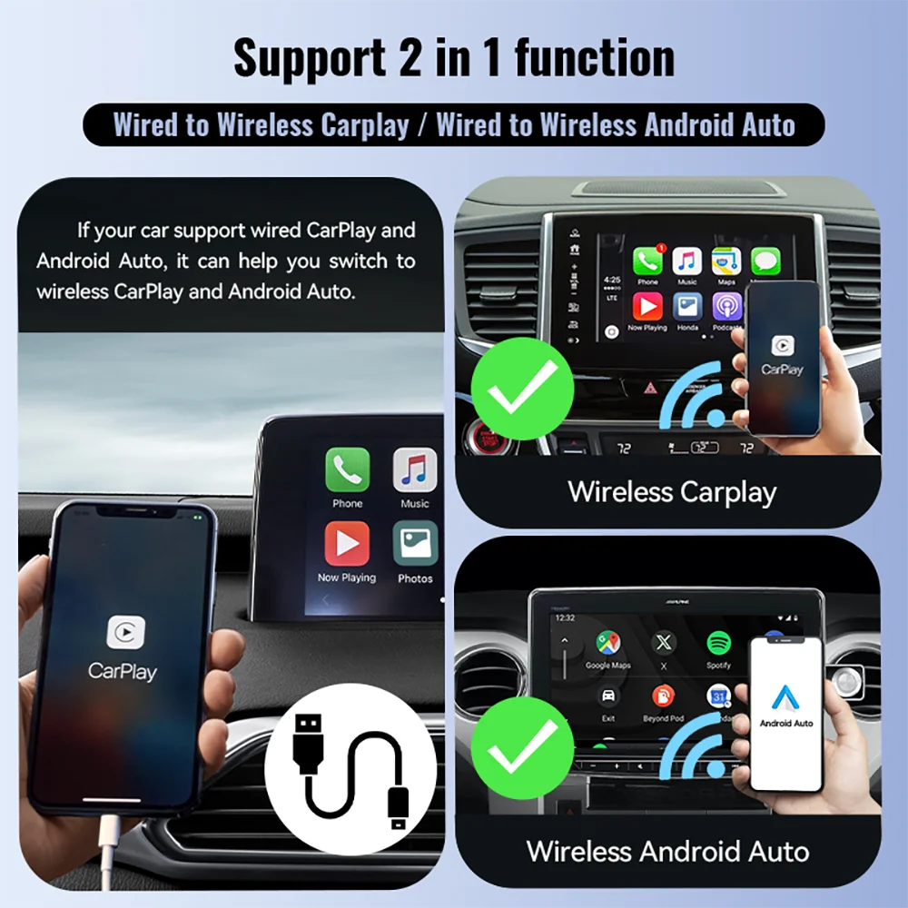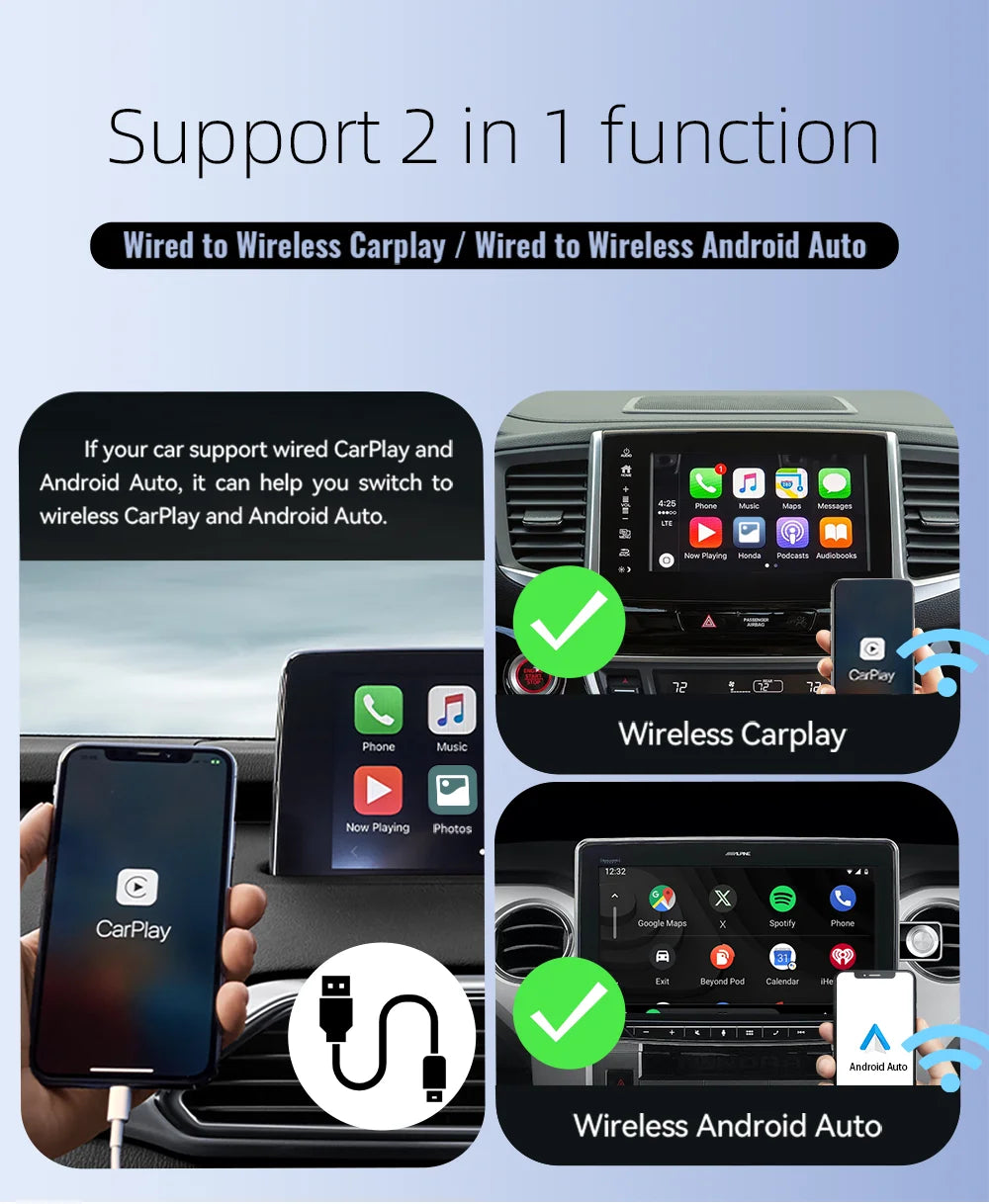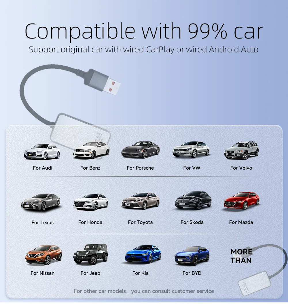 • Wide Compatibility: Works with 99% of vehicles supporting wired CarPlay or Android Auto, compatible with iPhones (iOS 10+) and Android devices (Android 11+).
