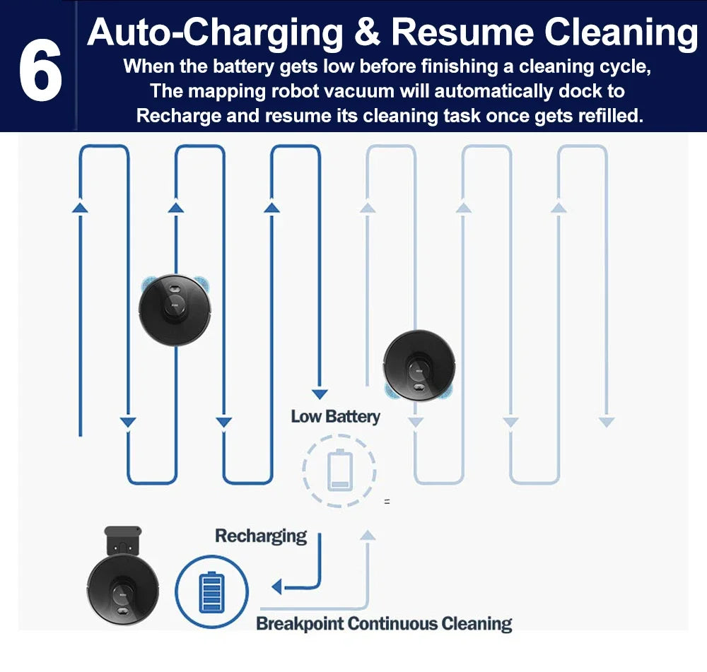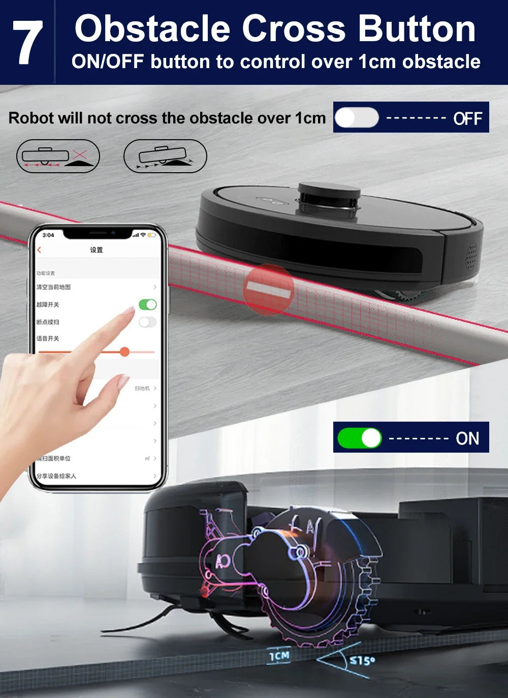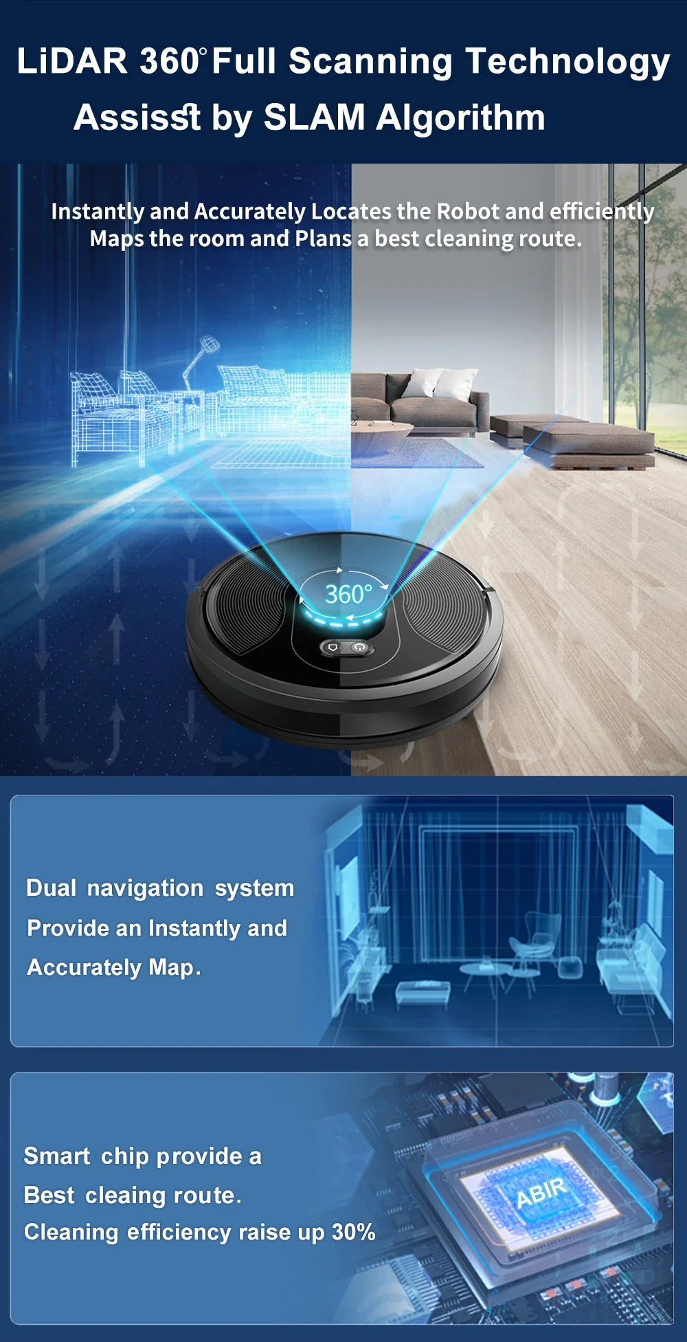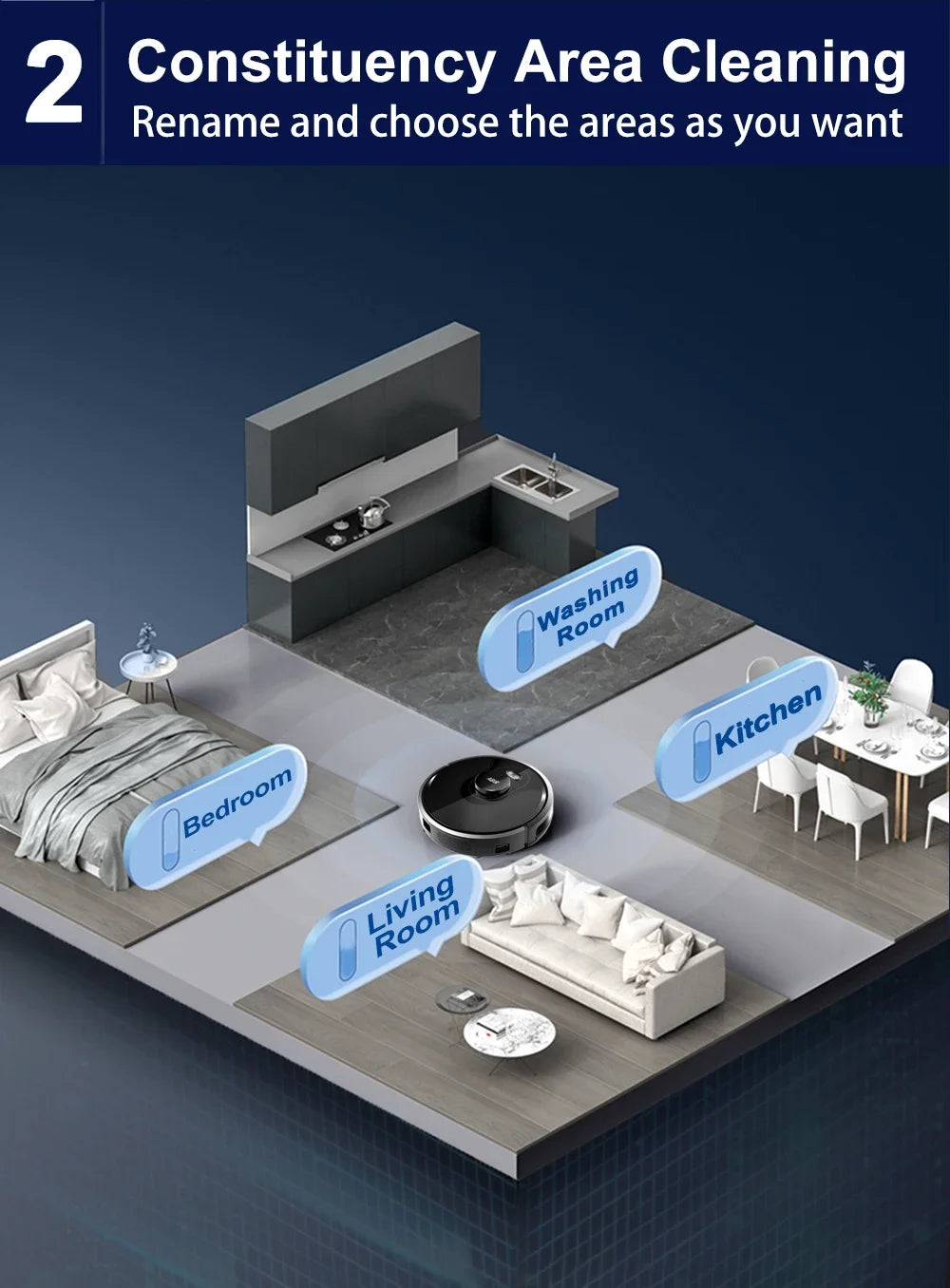 • Smart Navigation: Utilizing Laser and SLAM technology, this vacuum ensures precise navigation and comprehensive coverage of areas up to 220 square meters.