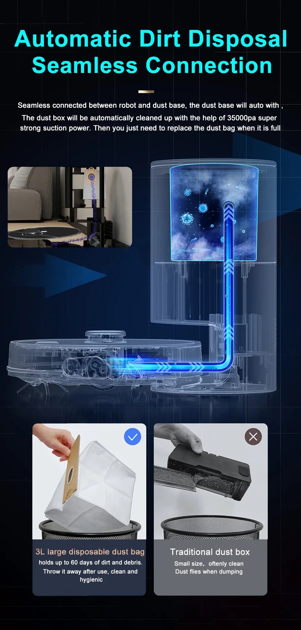• Self-Emptying Technology: This intelligent vacuum automatically disposes of dirt and debris, significantly reducing the time you spend on maintenance.