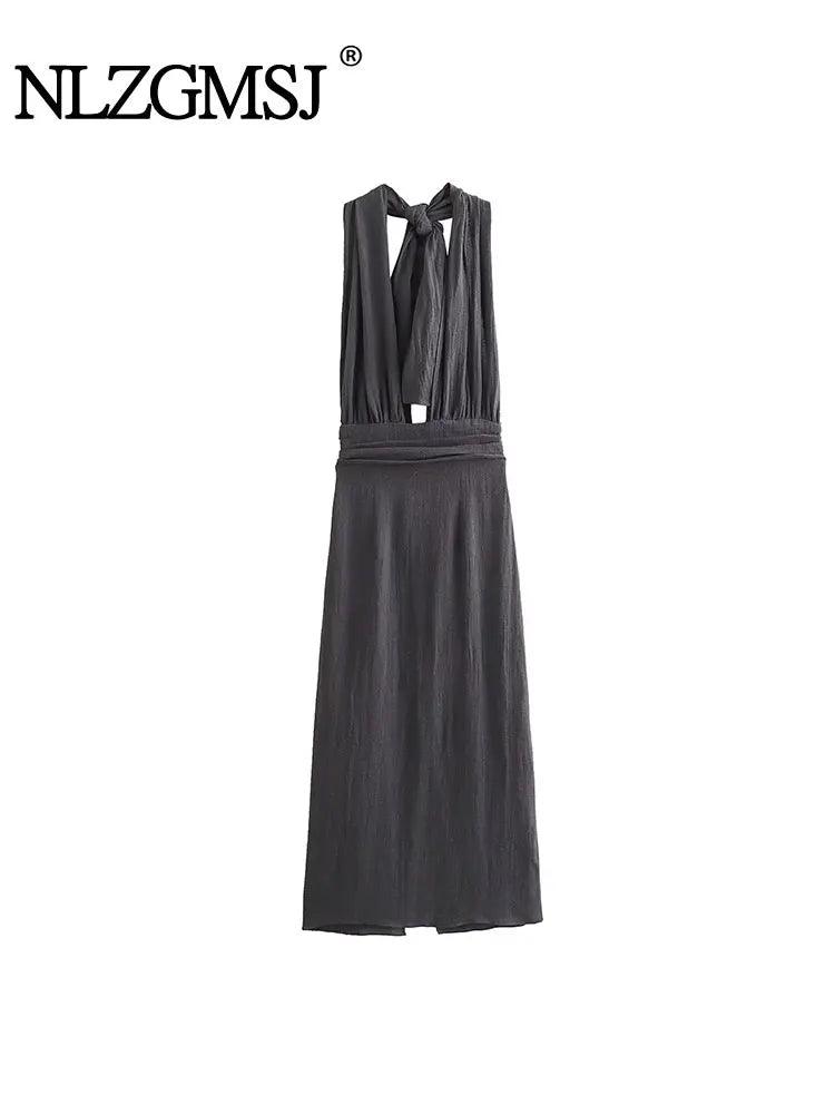 Nlzgmsj TRAF Women's Elegant V-Neck Halter Midi Dress Chic