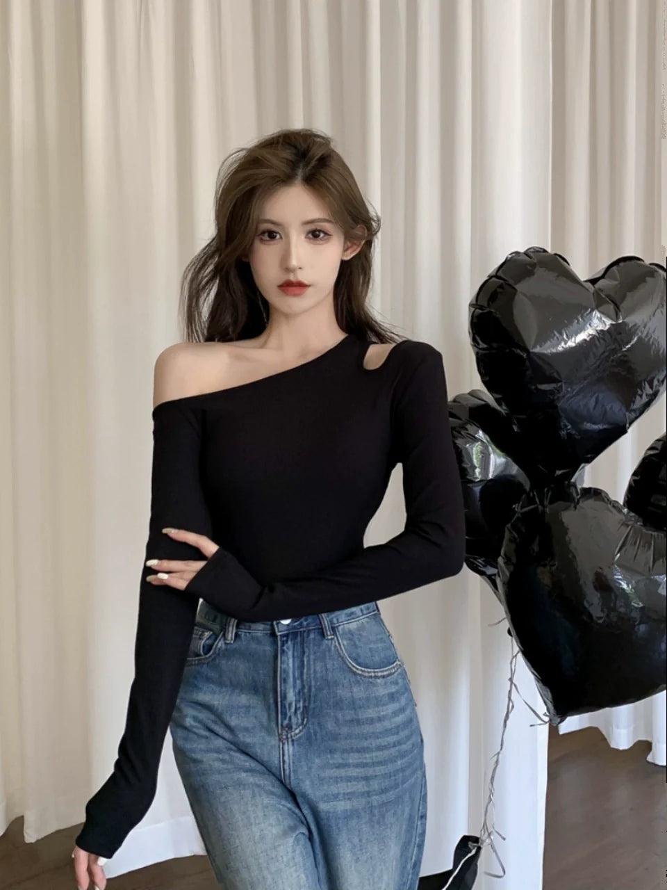 Off-the-Shoulder Black T-shirt Trendy Autumn Style Choice