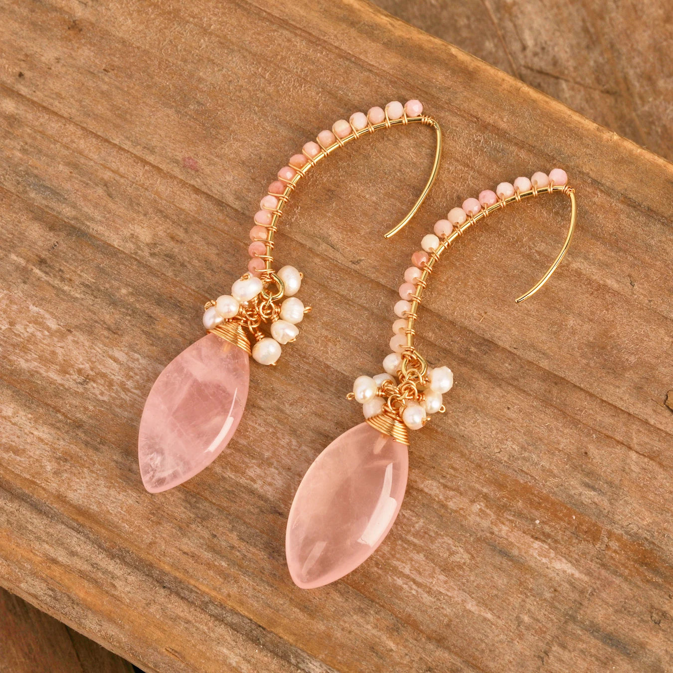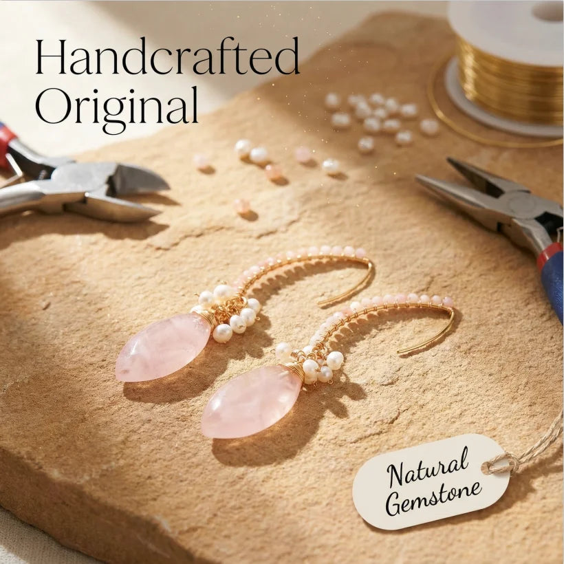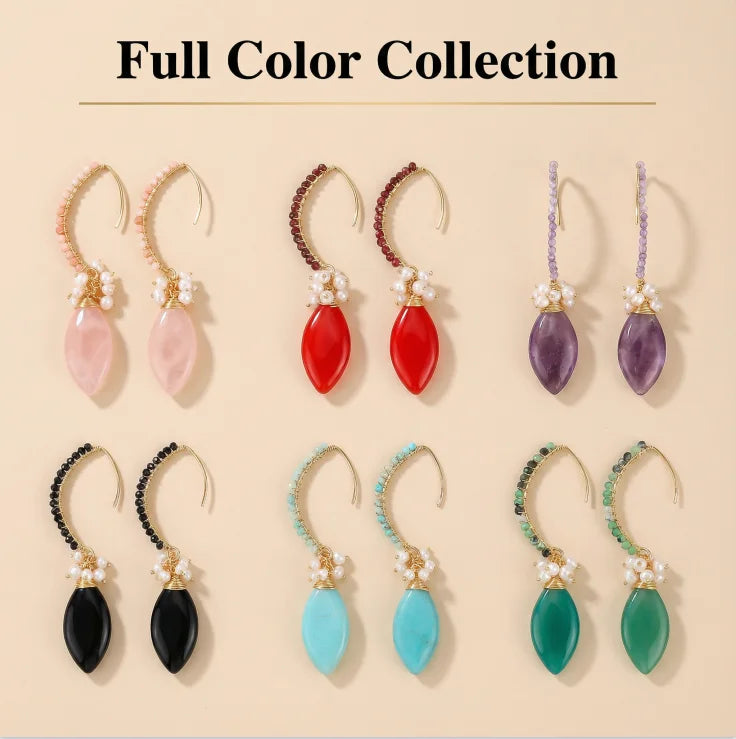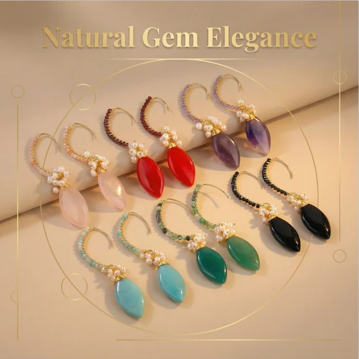 Main material: gemstone with crystal and rhinestone accents for subtle sparkle. Earring type: drop. Inlay technology: Flimming setting for a secure hold and a smooth, skin-friendly surface. Base metal: copper, finished with durable 18K gold or rose gold plating to resist tarnish and maintain luster over time.