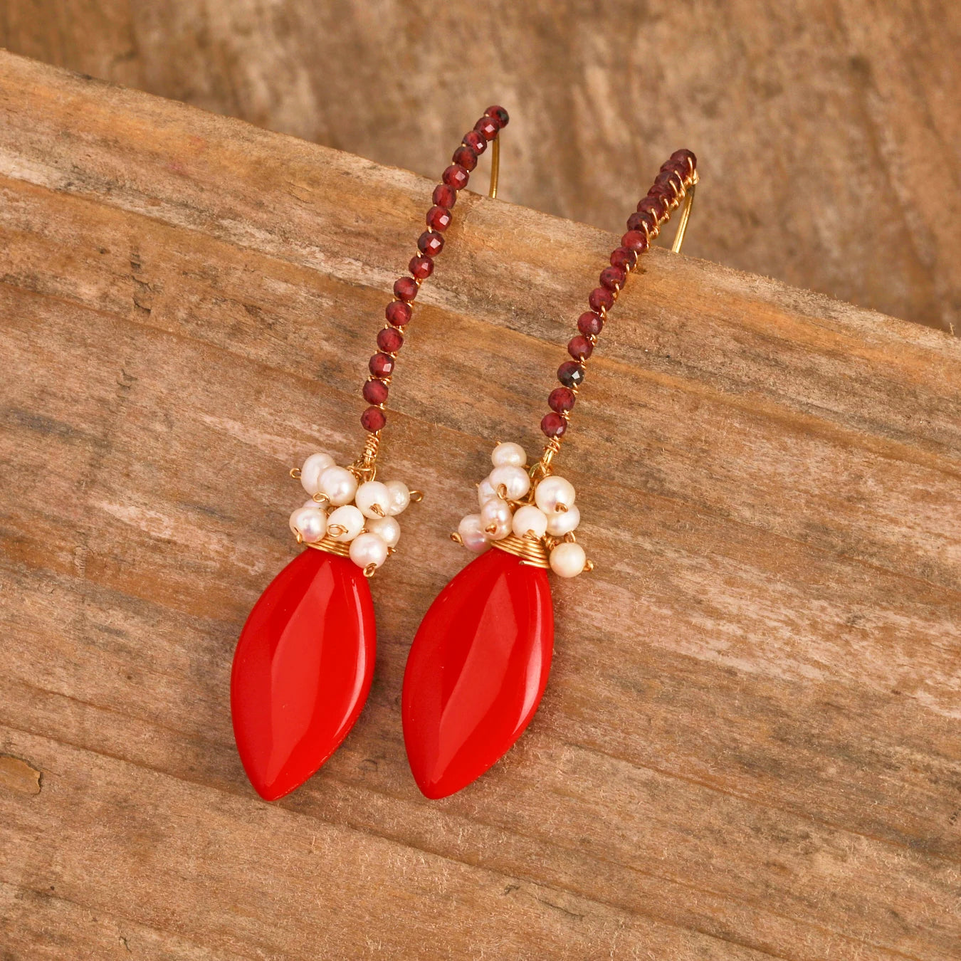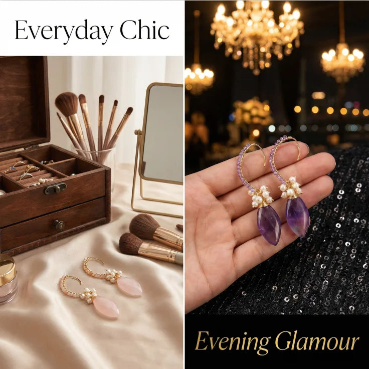 What makes these earrings stand out is the handmade attention to detail. Each pair is assembled by skilled artisans, ensuring that no two sets are exactly alike—a small variation that makes yours truly one-of-a-kind. The combination of red agate’s warm, earthy tones with amethyst’s cool violet hues creates a versatile color story that complements both casual and dressier looks.