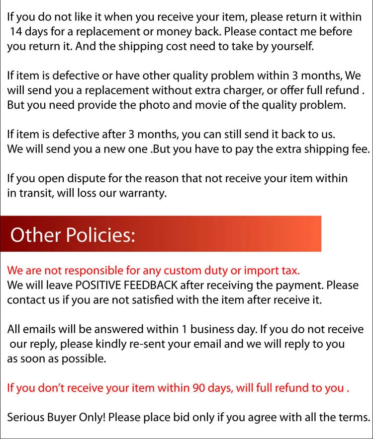 30 days returns. 100% Money back guaranteed no question ask. If the mistake is from Us. See details