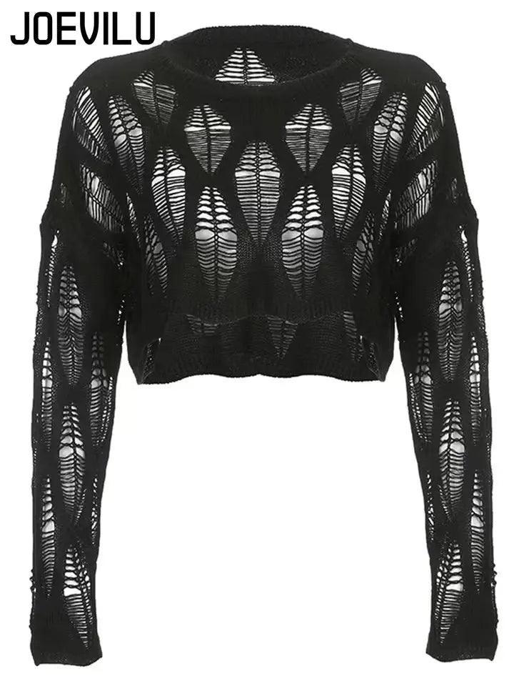 Discover unique styles today: Gothic Style Fashion, Y2K Style, and more with the Gothic Black Hollow Knit Blouse!