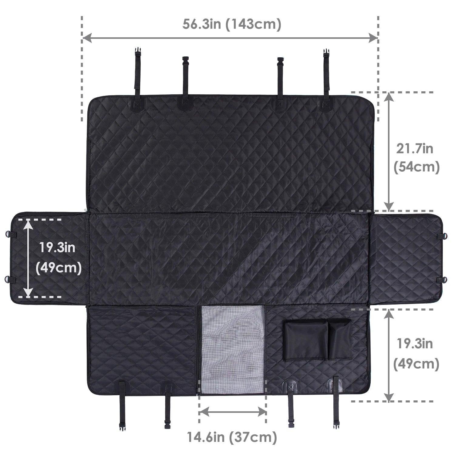 • Answer: The cover measures 143cm wide by 152cm long, providing ample coverage for larger dogs and multiple pets when used as a hammock. This setup supports a spacious, comfortable ride while protecting the interior of your car or SUV.
