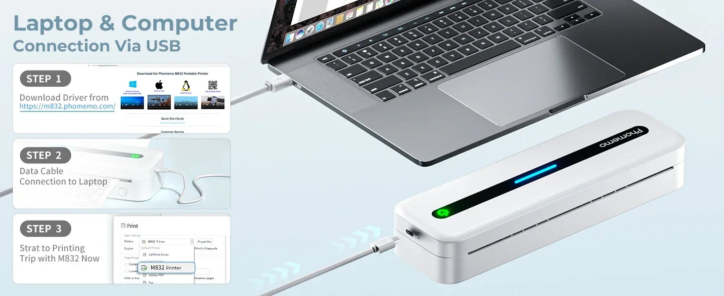 • Portable Wireless Printer: Lightweight and compact, the M832 is ideal for on-the-go printing, perfect for travel and business use.