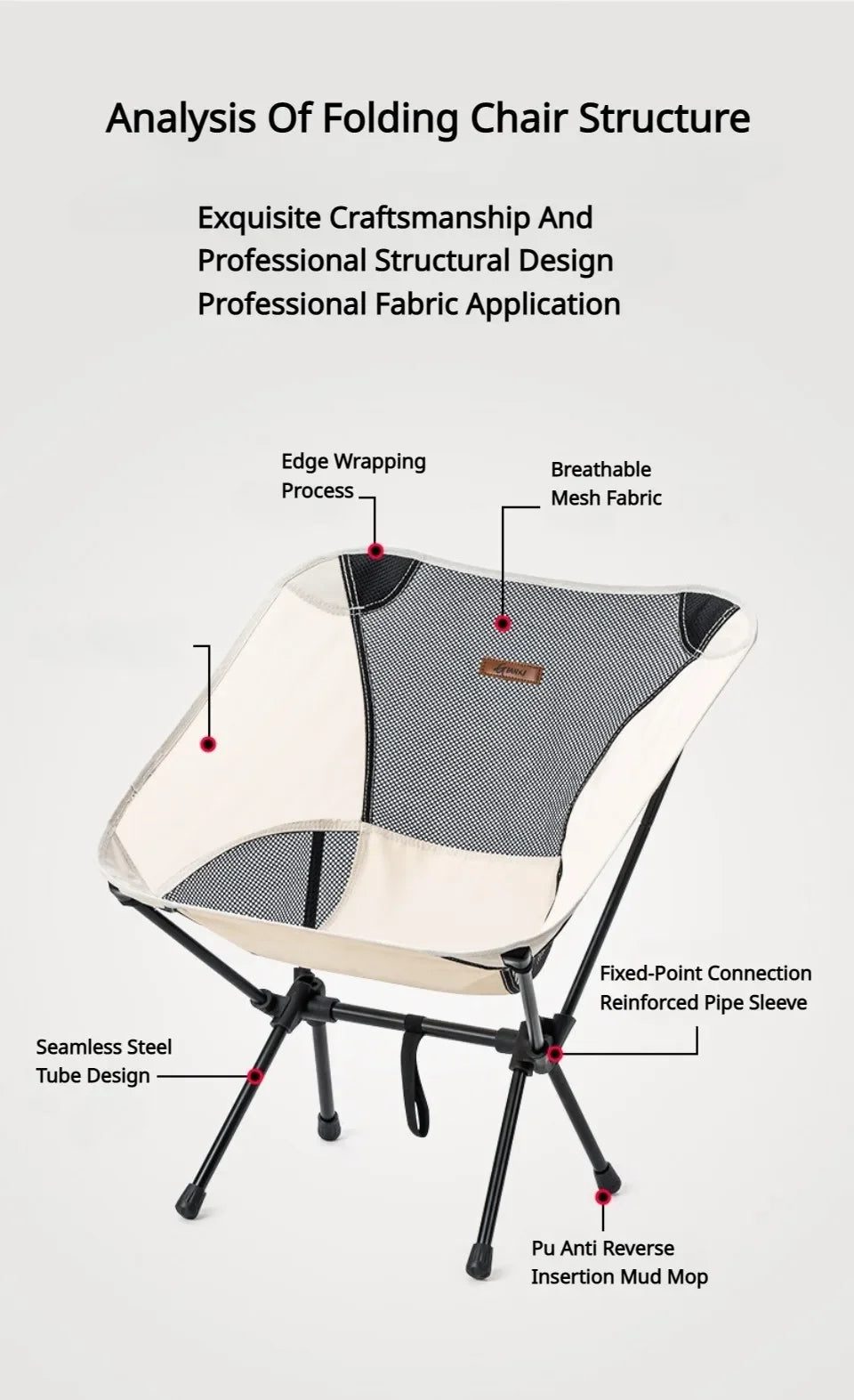 A: This ultralight camping chair combines a foldable moon chair design with a lightweight frame, making it an outdoor recliner that travels easily from beach to campsite. Its compact form is perfect for picnics, fishing trips, and other adventures where you need portable seating without bulk.