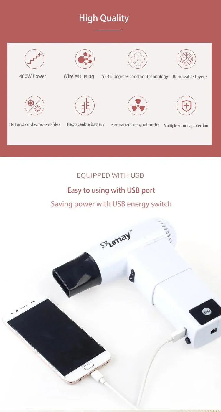 With over 18 years in the industry, UMAY is a name you can trust. Our Portable Hair Dryer with USB Output Portable Cordless Blower has gained popularity for its exceptional quality and convenience.