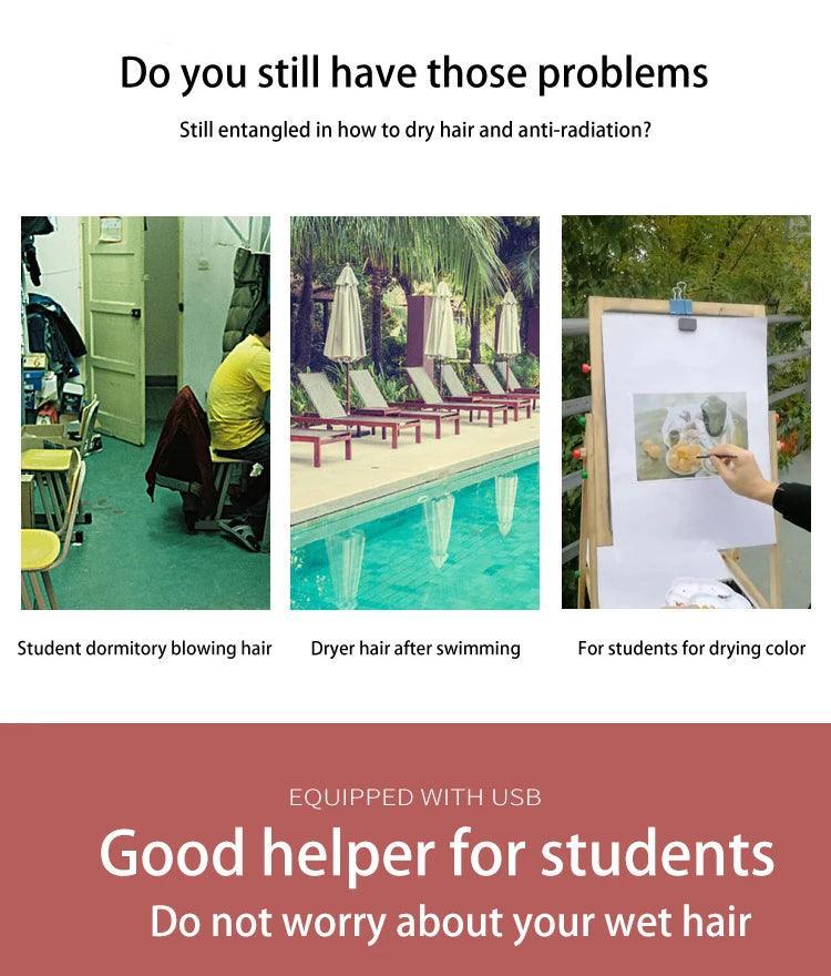 Beyond personal use, the Portable Hair Dryer is practical for families, swimmers, and outdoor enthusiasts. It’s gentle enough for baby care routines, yet powerful enough to handle thicker hair. As a versatile portable blower, it dries damp hair in minutes after a swim, dries pet fur after a bath, and even helps with speedy towel-drying in a pinch.