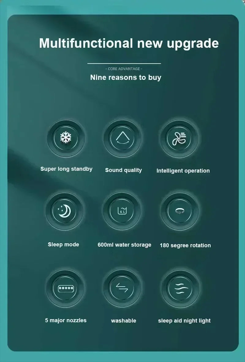 • Large Water Capacity: Equipped with a 600ml water tank, it can run continuously for up to 12 hours, providing refreshing mist for extended periods.