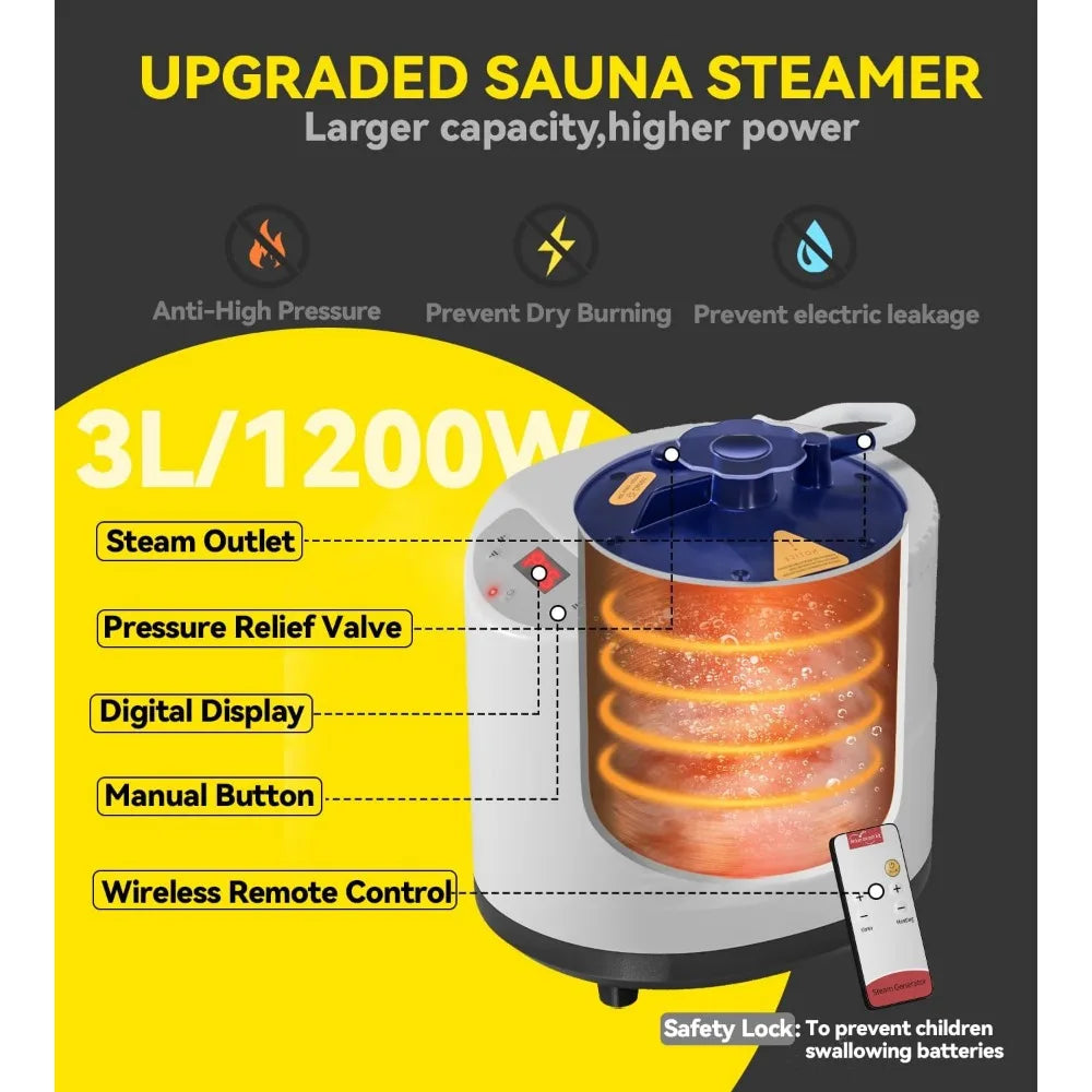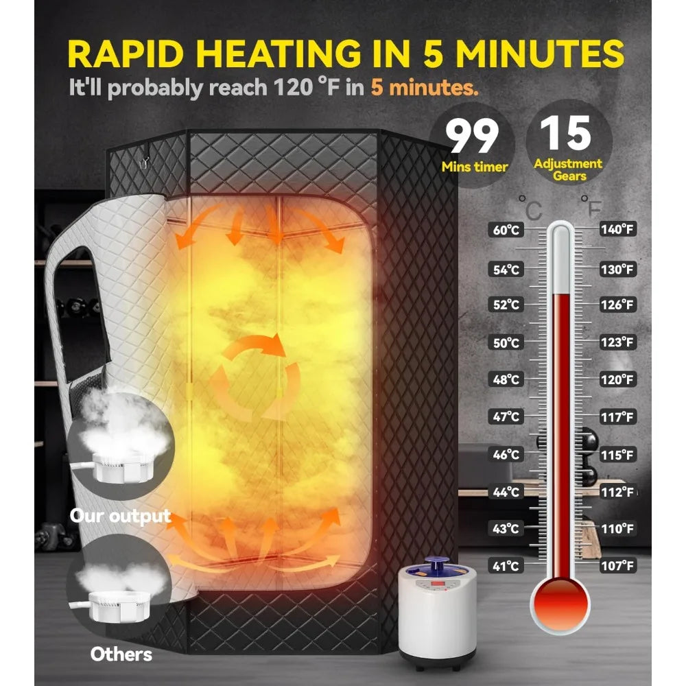 • 15 Levels of Heating: Customize your warmth with 15 temperature settings and a 99-minute timer. The powerful 1200W steam generator heats the sauna to a soothing 130°F - 140°F in just five minutes.
