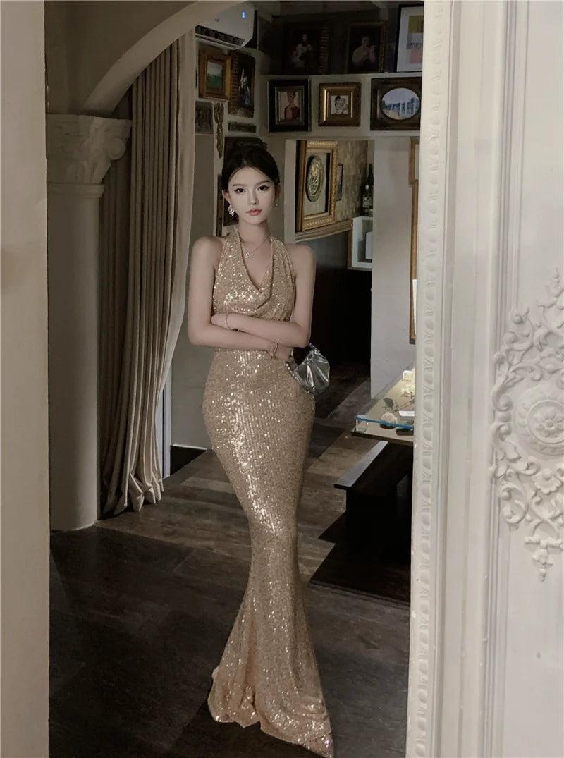 Step into a realm of sophistication with our Pure Champagne Shiny Swing Collar Dress Sophisticated Elegance, a true masterpiece for the modern woman. Crafted from high-quality silk and adorned with shimmering sequins, this stunning dress is designed for those who appreciate refined occasion wear.