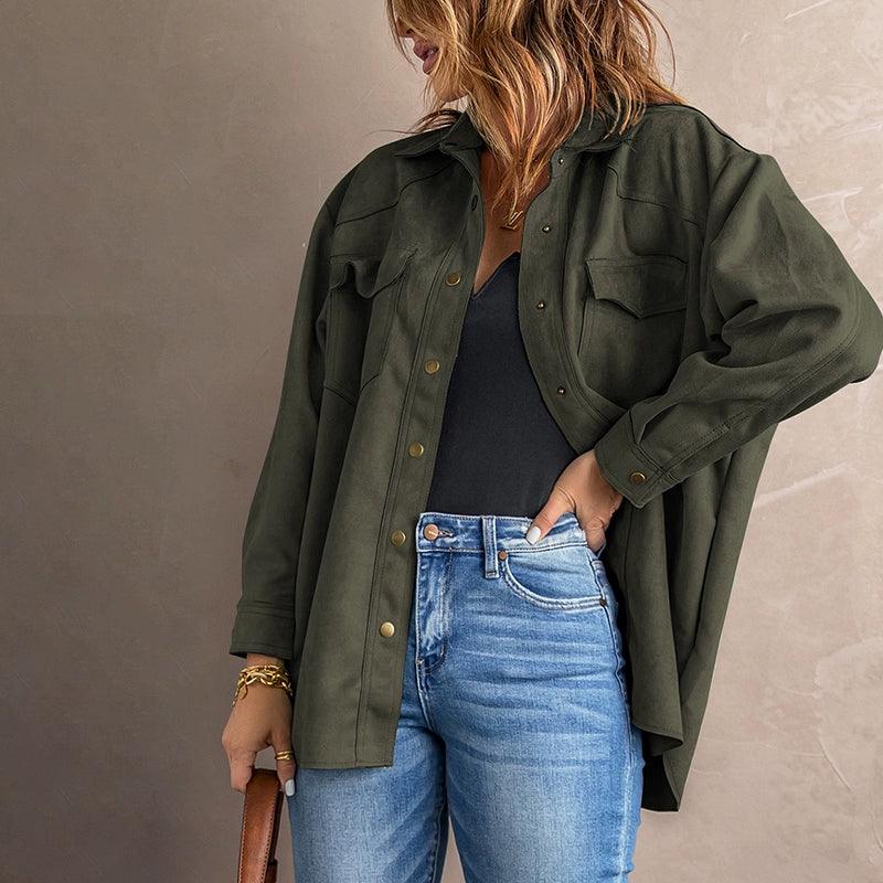 Pure Color Snap Button Loose Suede Shirt Coat Suede Chic