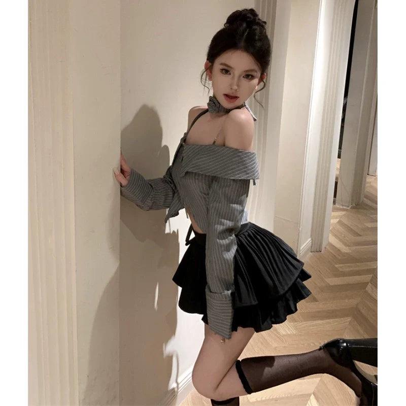 #2048266167243813-Black skirt + gray shirt (two-piece set with halter)-M