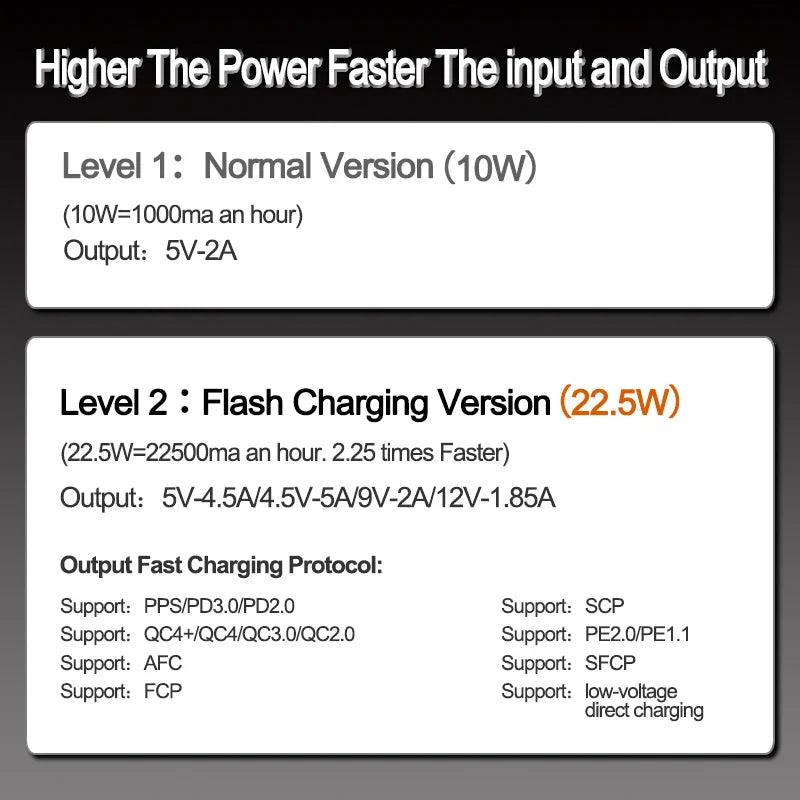 • Flash Charging Version: 22.5W Super Fast Charge (5V-4.5A/4.5V-5A/9V-2A/12V-1.5A)