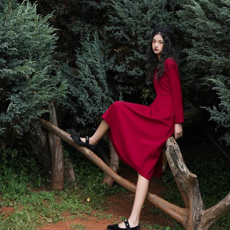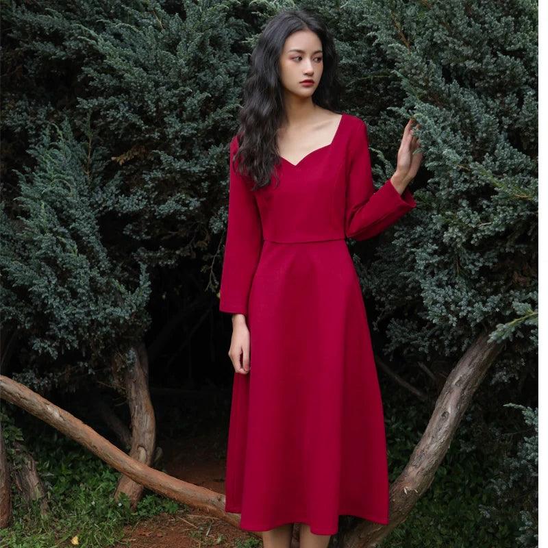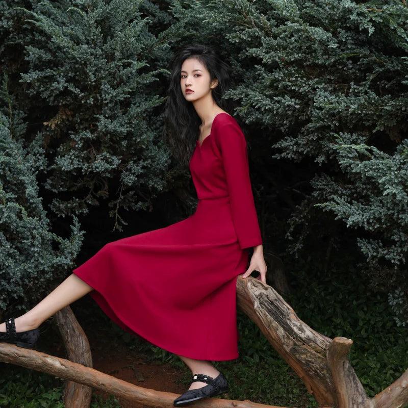 Step into elegance with the Retro Red Vintage Chic Dress Stylish Nine-Quarter Sleeve. This dress perfectly fuses classic charm with modern trends, making it an essential addition to your wardrobe.
