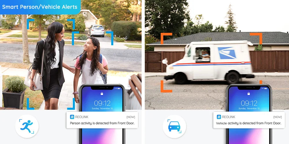 • Smart Motion Detection: The system distinguishes between people and vehicles, sending you alerts only when it matters most.