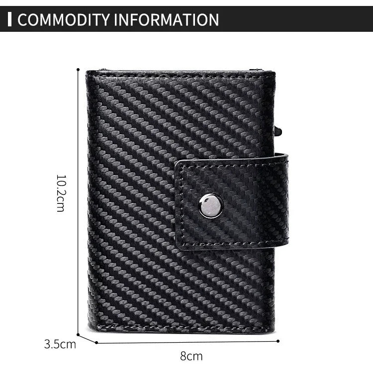 The Crazy Horse Leather Automatic Card Holder Wallet For Men combines premium texture with practical tech. Its durable Crazy Horse leather gains a unique patina over time, while the Airtag-ready cavity keeps your essentials traceable. The carbon fiber motif adds a subtle, premium edge, making this wallet a stylish companion for meetings, travel, and everyday use.