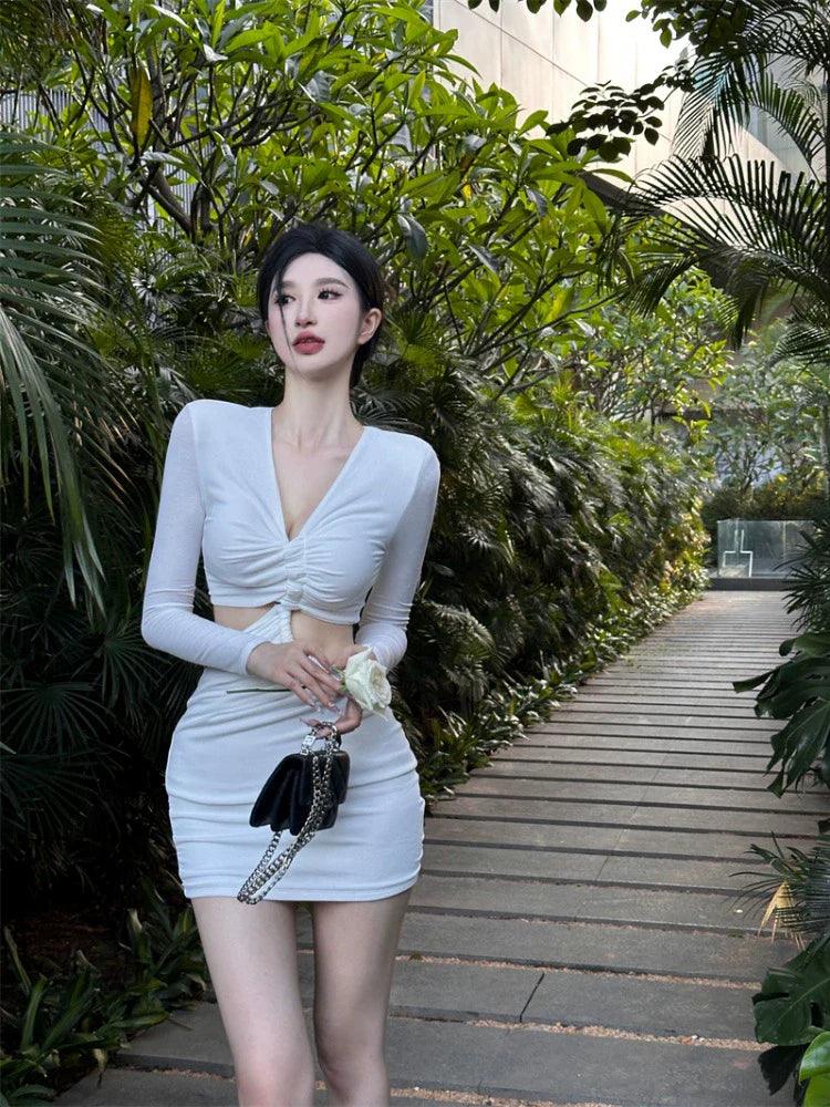 Don't miss out on owning this statement piece! Order now and redefine your wardrobe with the Spice Girls Vibe Ruched Hollow-out V-neck Slim Fit Skirt.