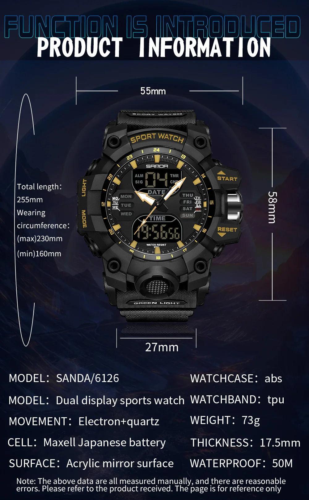 Discover the SANDA Men Sports Watch Military Design Upgrade Dual Display, a perfect blend of rugged style and advanced technology, tailored for adventurers and sports enthusiasts. This multifunctional timepiece is your ultimate companion, whether you're hitting the trails or diving into the water.