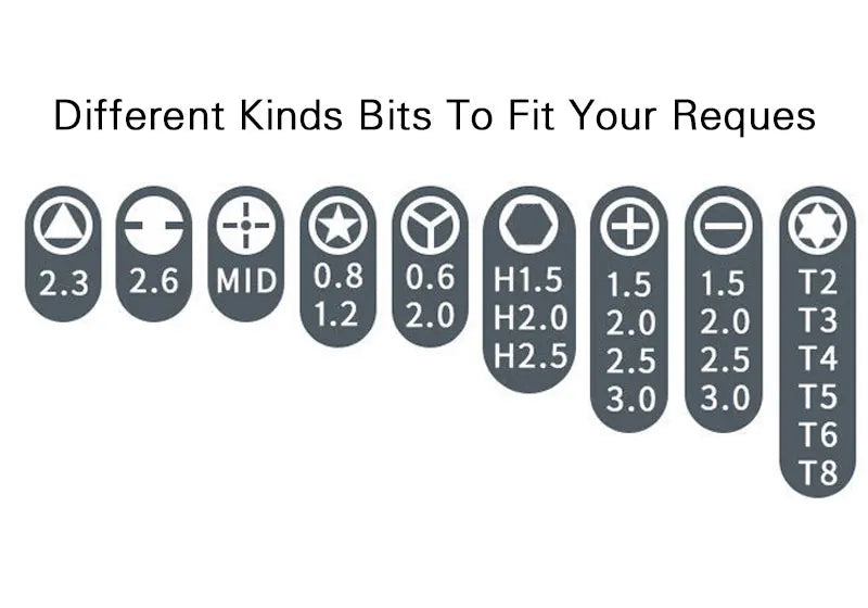 • Versatile Bit Types: Features a wide range of screw head types including Phillips, Torx, Hex, and more.