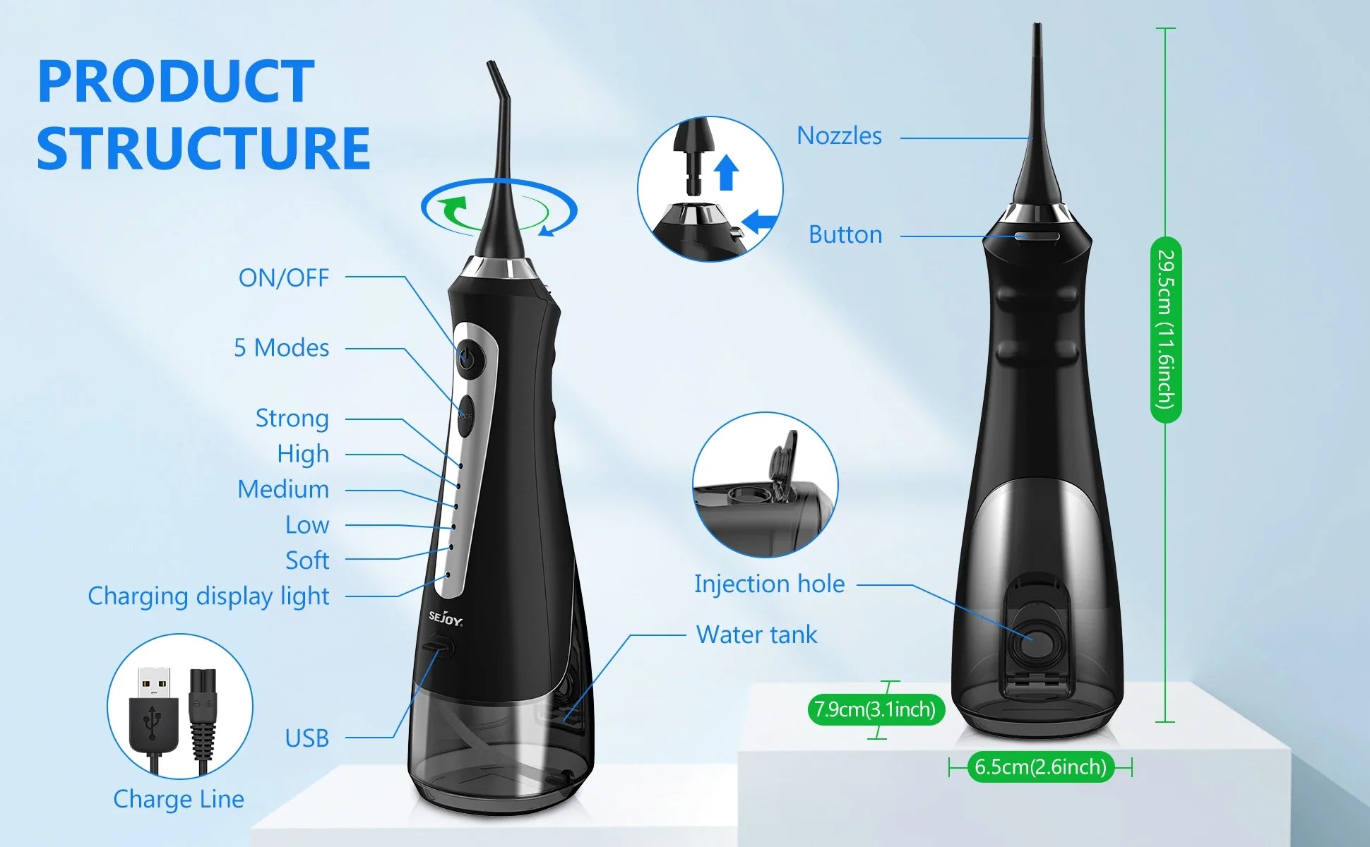 Transform your dental hygiene routine and experience the difference with the SEJOY New Irrigator Dental Water Flosser 5 Modes USB IPX7. Ideal for both home use and travel, this product ensures you maintain optimal oral health no matter where you are.