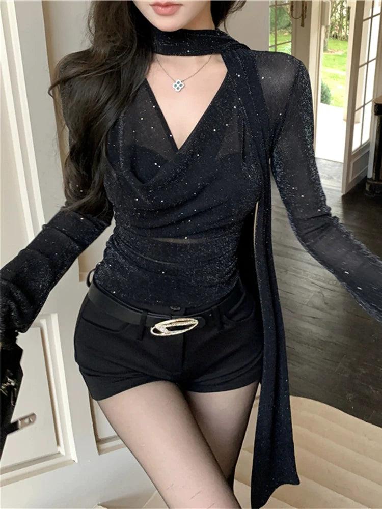 Don't miss out on the chance to elevate your wardrobe! Order now and embrace your glamorous side with the Sequined V-Neck T-Shirt Sparkling Glamour for Party Fashion.
