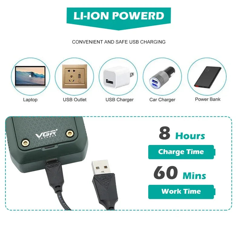 The VGR V353 is a versatile electric beard trimmer designed for men who value convenience, quality grooming tools, and precise results. This Electric Razor Portable Beard Trimmer for Men is compact and very easy to use, making it an ideal choice for daily grooming needs. It delivers a smooth, close trim every time, ensuring a polished, well-maintained appearance that lasts.
