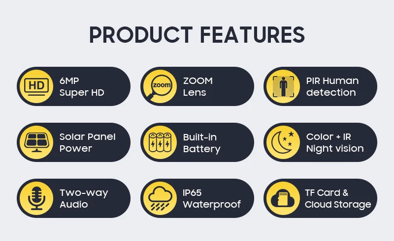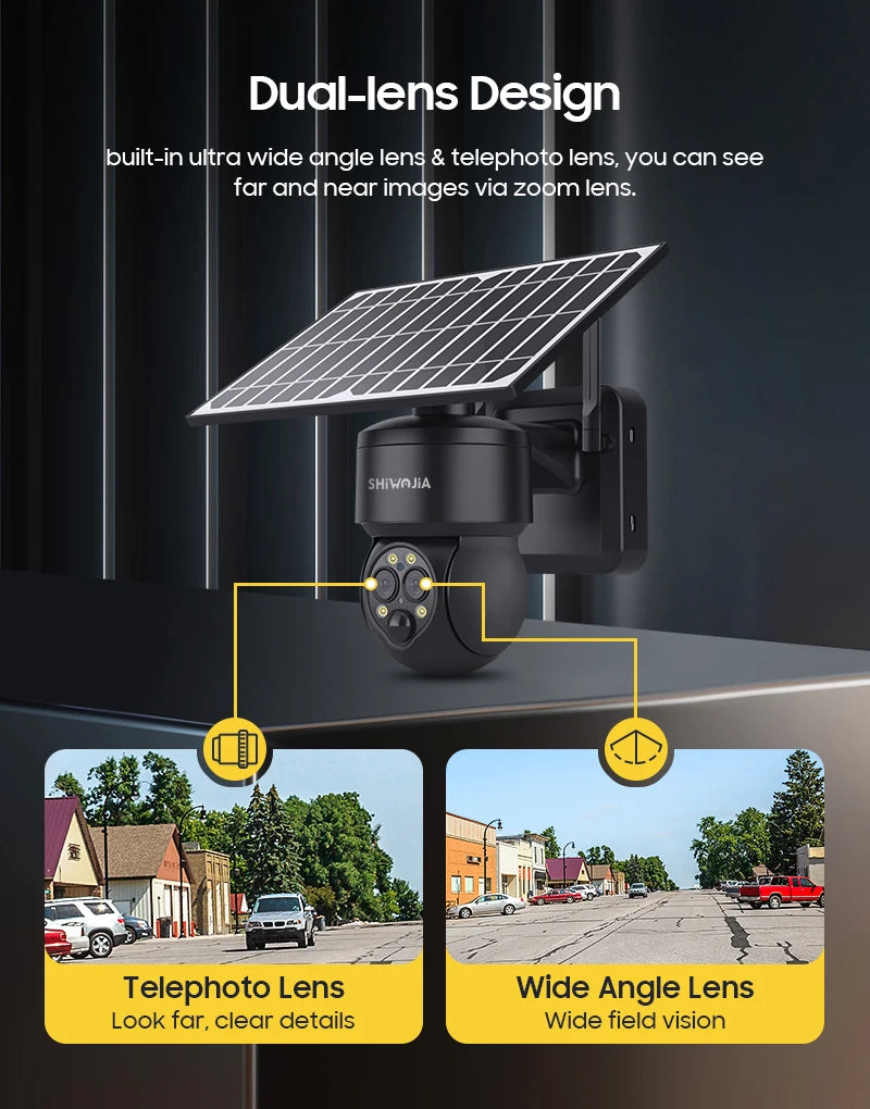 Introducing the SHIWOJIA 4G SIM Solar Camera WIFI 6W Dual Lens 12X ZOOM – your ultimate security solution that combines cutting-edge technology with eco-friendly design. This advanced solar camera ensures uninterrupted surveillance with its robust 12X zoom and impressive 8MP 4K resolution, making it a perfect choice for outdoor monitoring.