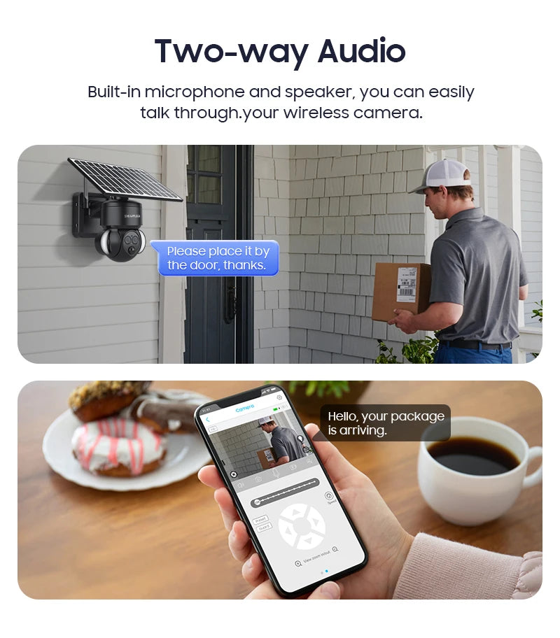 • Two-Way Audio: Communicate directly via the camera, making it easy to interact with visitors or deter intruders.
