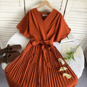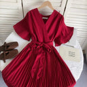 Solid Color High Waist Slim-Fit Pleated Dress Cross Strap