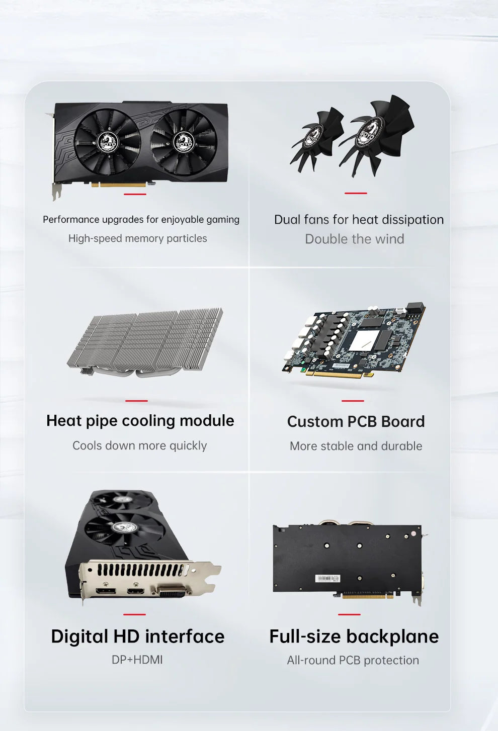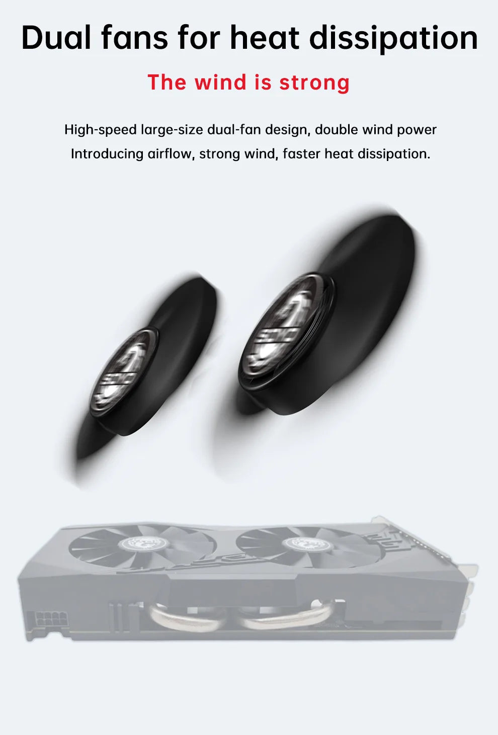 • 2. Efficient Cooling System: Designed with an innovative double fan cooler for optimal heat dissipation, maintaining peak performance even during intense gaming sessions.