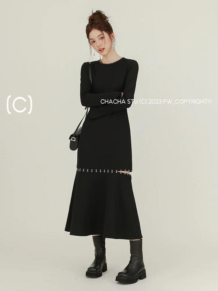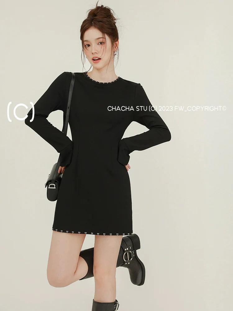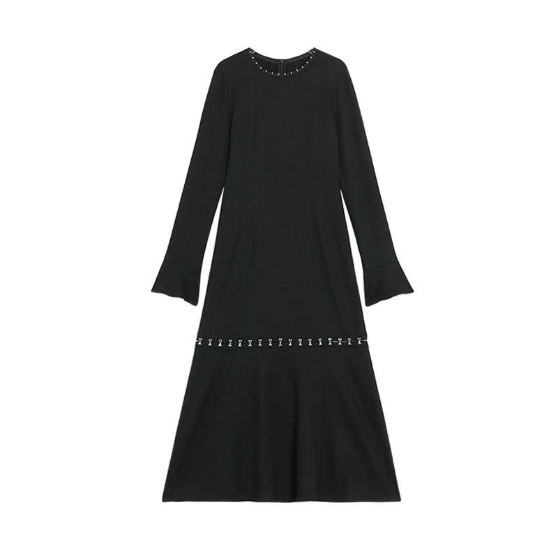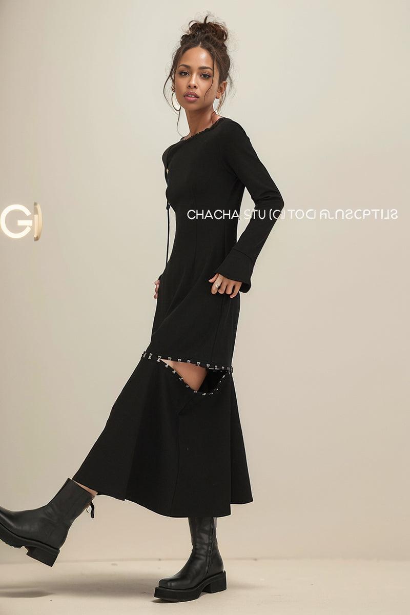 Fashionable Black Long Sleeve Dress Versatile A-Line Style