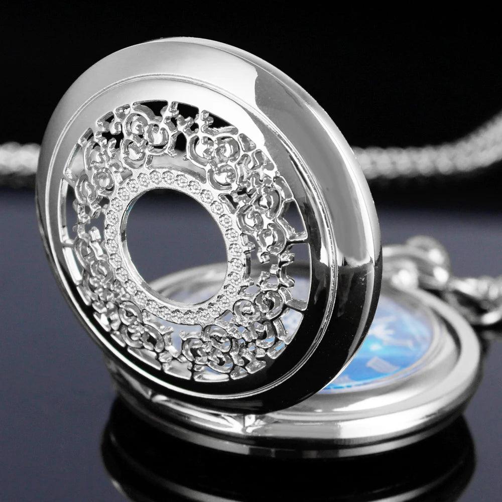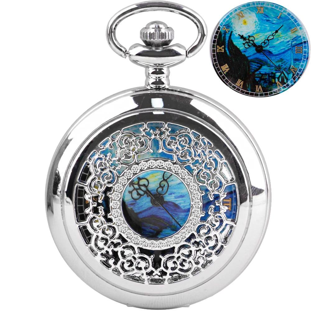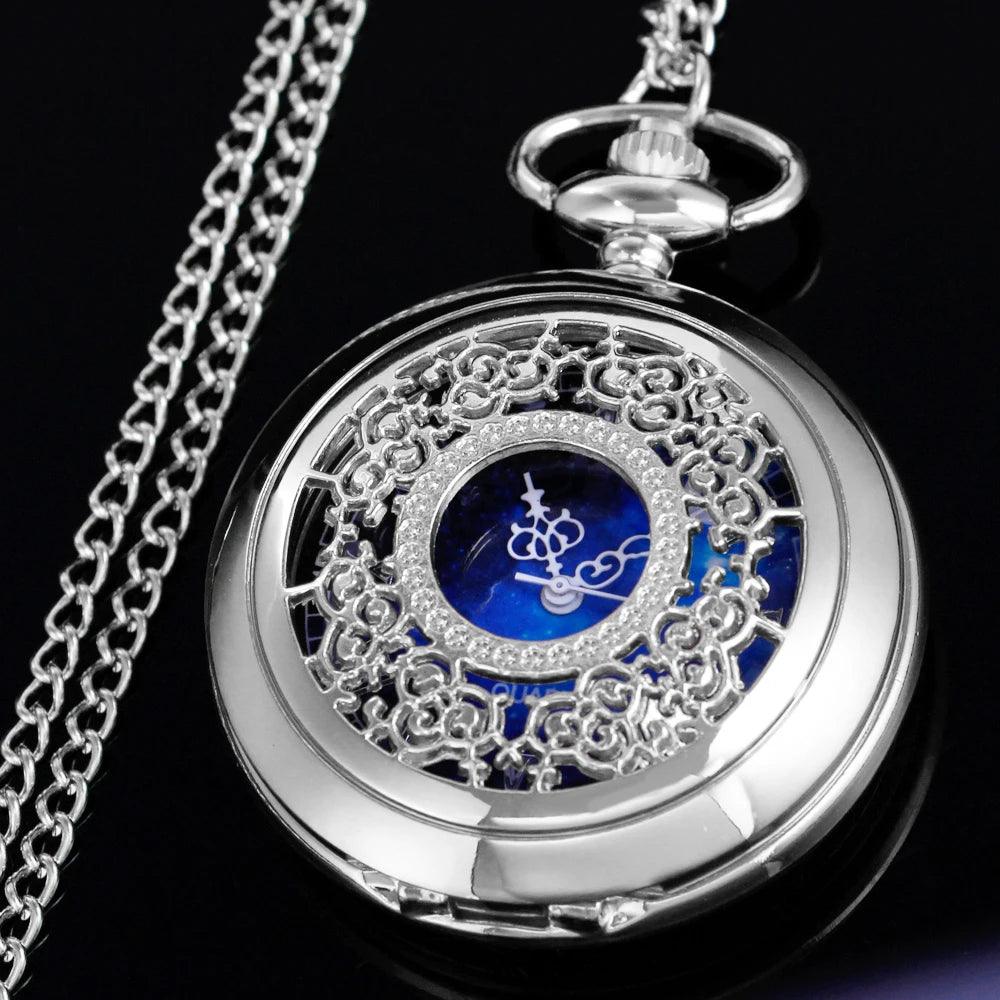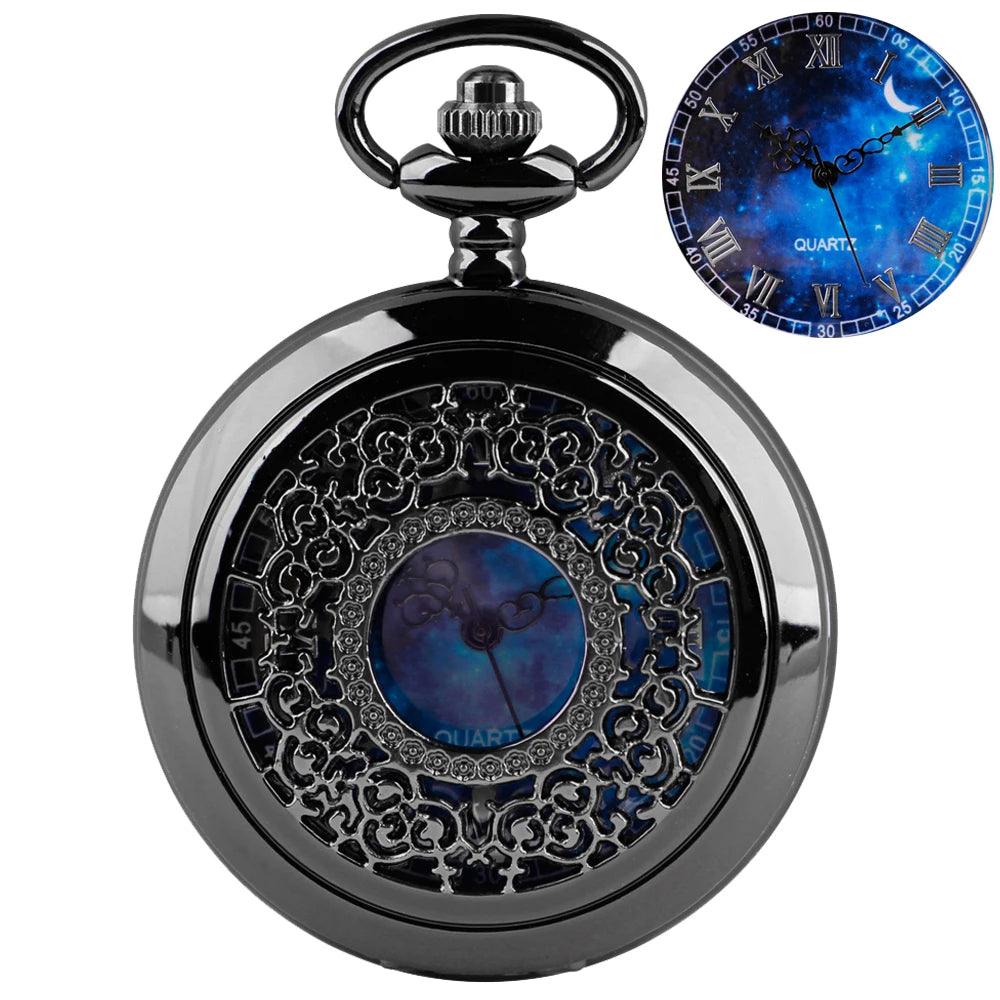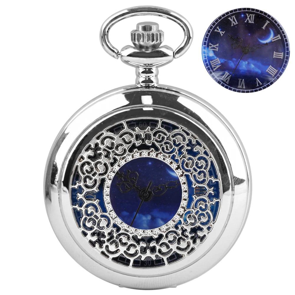 The enchanting hollow blue starry sky dial, accented by classic Roman numerals, transforms this pocket watches into a visually striking accessory.