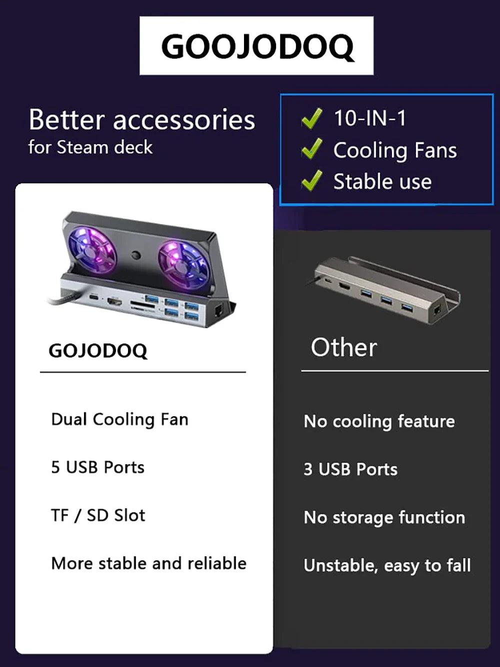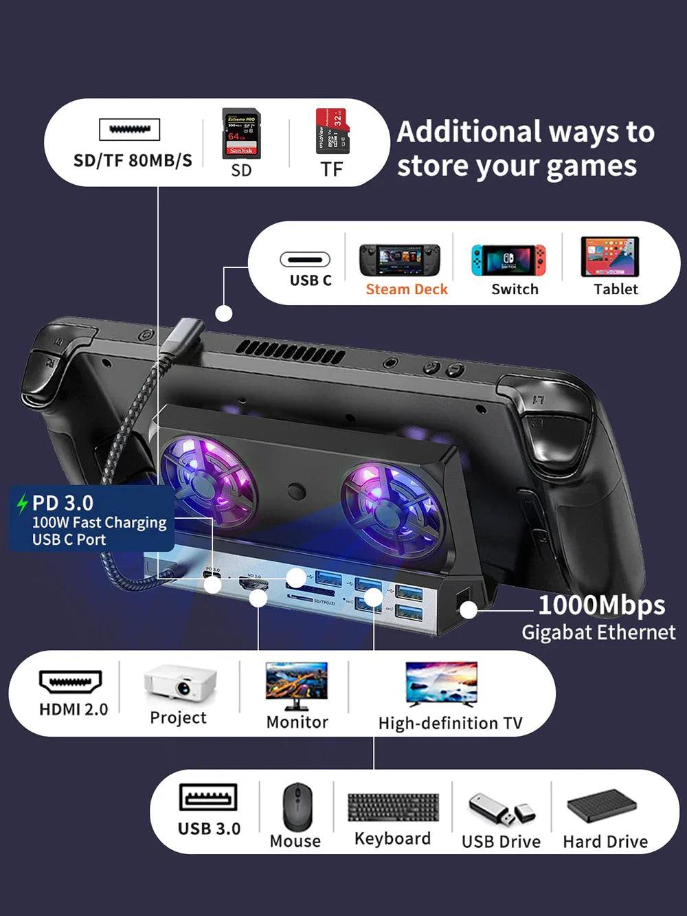 Elevate your gaming experience with the Steam Deck Dock Docking Station with Fan 10-in-1 HDMI 4K. This multifunctional docking station is designed to enhance your gaming setup by providing essential features that improve performance and connectivity.