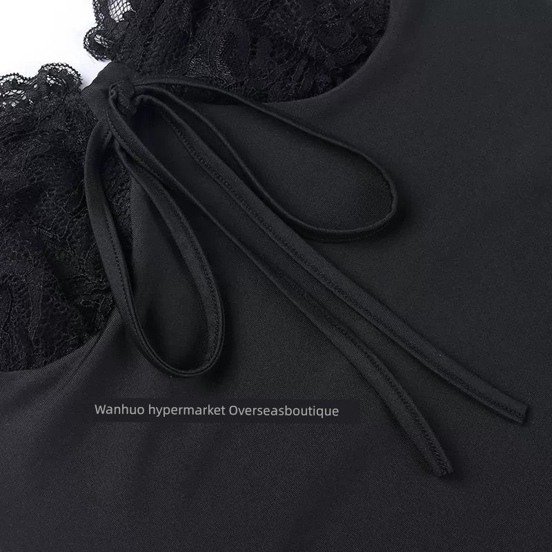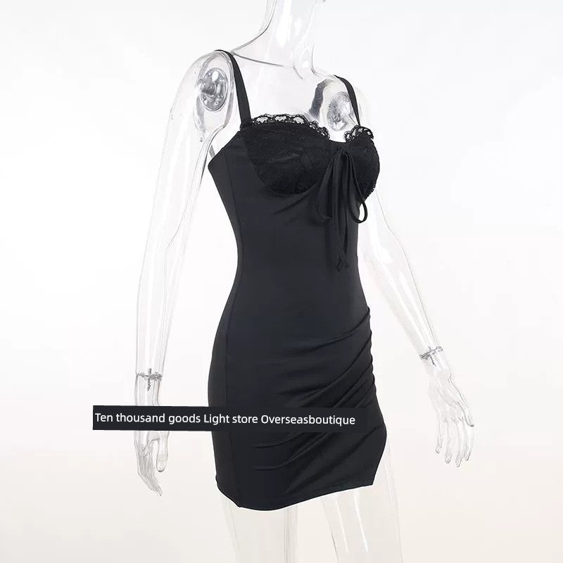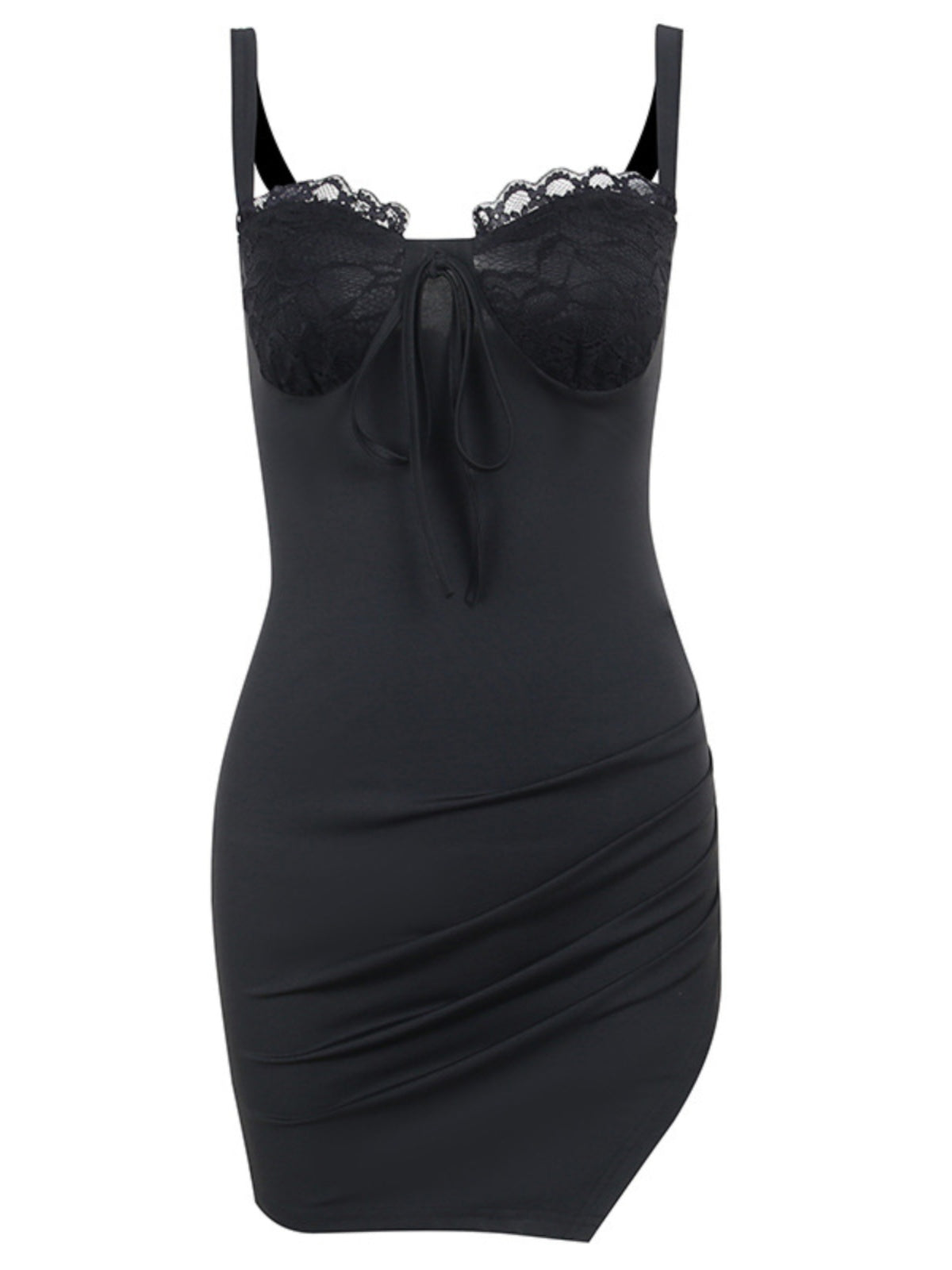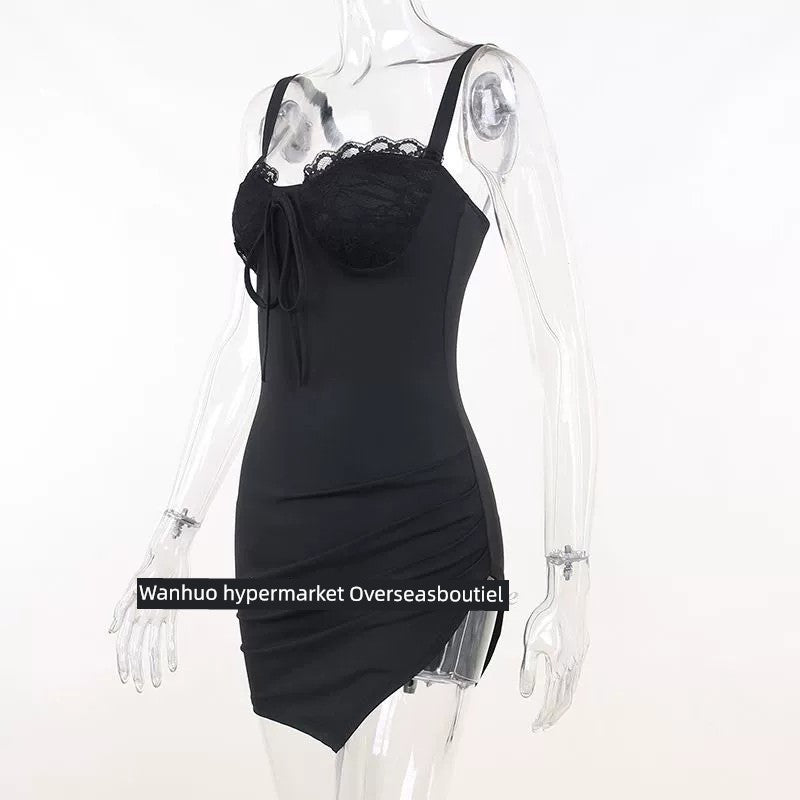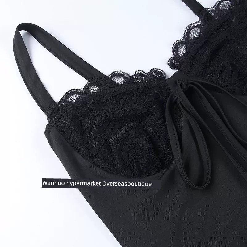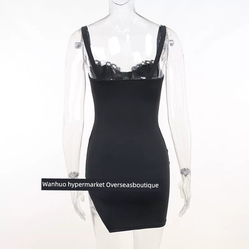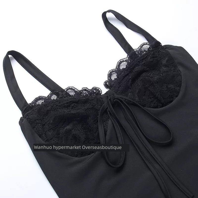 Split Spy Girl Strap Dress V Neck Lace Trim Slim Fit Slit