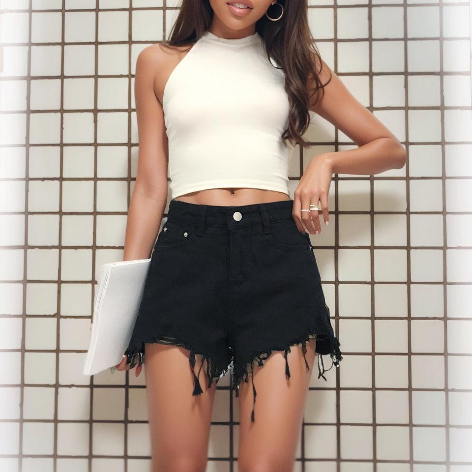 Denim High Waist Shorts: Edgy Raw Edge Design Chic Fit