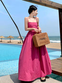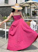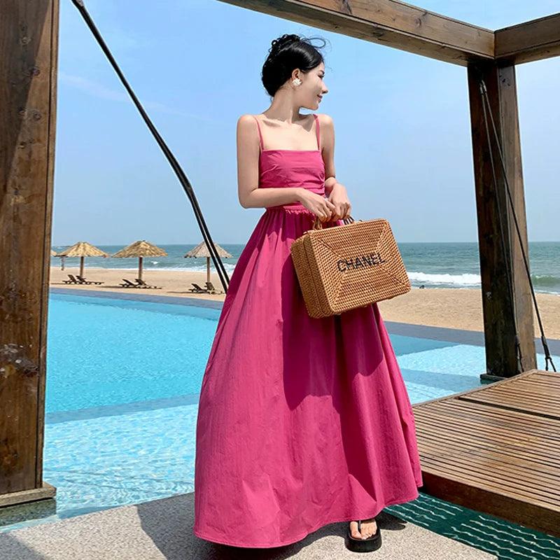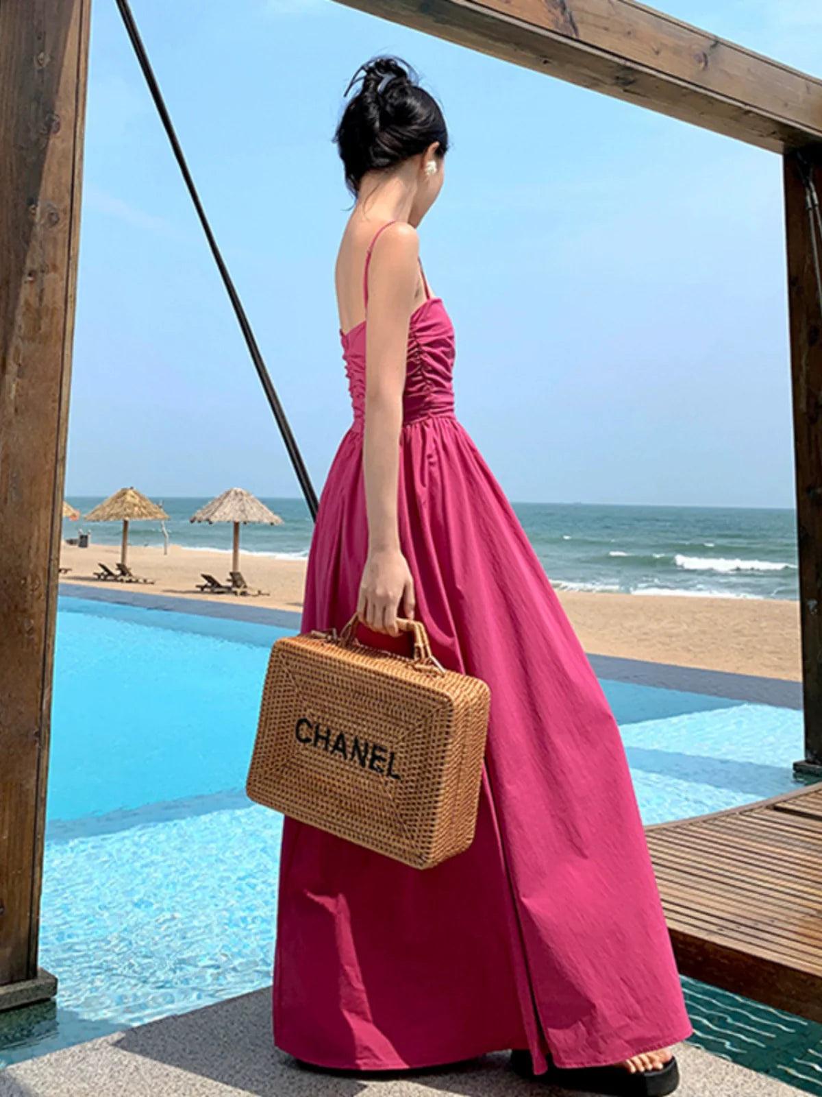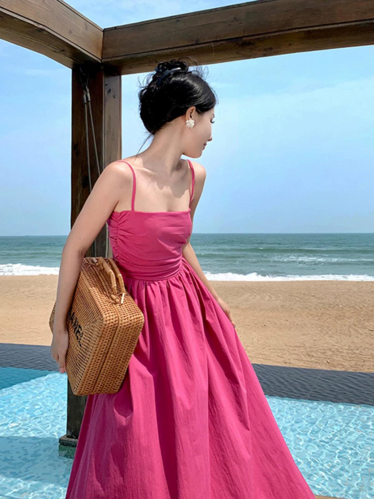 Rose Red French Style Seaside Sling Dress Summer 2023 Beachwear