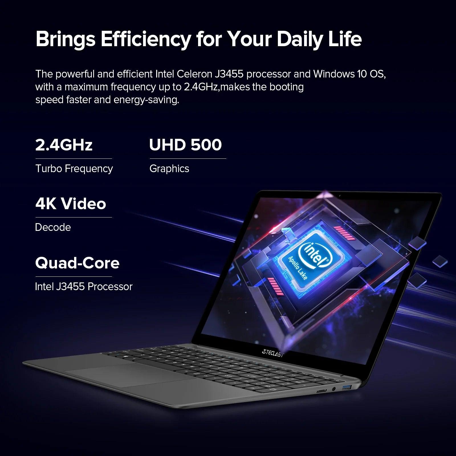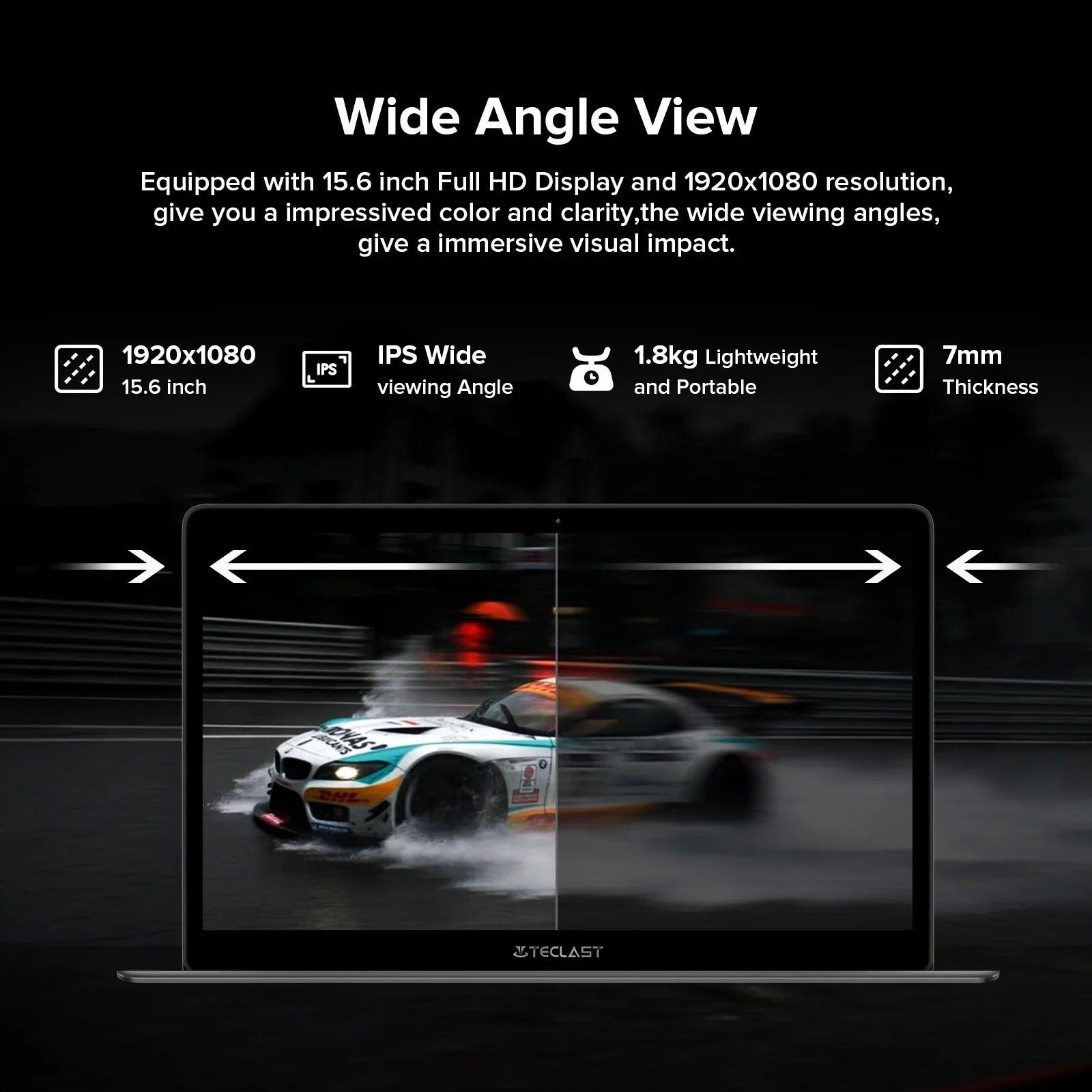 Operating System: Windows 10, Processor: Intel Apollo Lake, Graphics: Intel HD Graphics 500, RAM: 8GB, Storage: 128GB (expandable), Display: 15.6 inches, 1920x1080 resolution, IPS.
